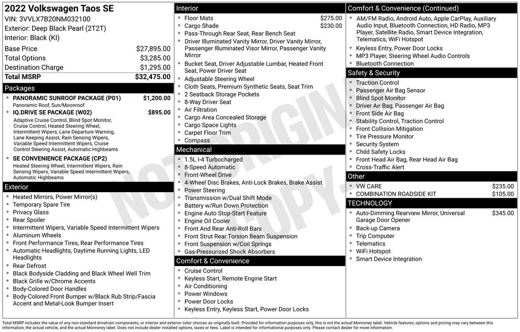 2022 Volkswagen Taos 1.5T SE Certified. Deep Black 1.5T SE FWD 8-Speed Automatic with Tiptronic 1.5L I4 Turbocharged DOHC 16V LEV3-SULEV30 158hp Volkswagen Certified, 3.23 Axle Ratio, 4-Wheel Disc Brakes, 6 Speakers, ABS brakes, Active Blind Spot Monitor, Adaptive Cruise Control (ACC) w/Stop & Go, Air Conditioning, Alloy wheels, AM/FM radio: SiriusXM with 360L, Automatic Rain-Sensing Front Wipers, Brake assist, Bumpers: body-color, Cargo Area Retractable Privacy Cover, CloudTex & Cloth Seating Surfaces, Compass, Delay-off headlights, Driver door bin, Driver vanity mirror, Dual front impact airbags, Dual front side impact airbags, Electronic Stability Control, Emergency Assist, Emergency communication system: Car-Net, Exterior Parking Camera Rear, First Aid Kit, Frameless Auto-Dimming Rearview Mirror (SRV), Front anti-roll bar, Front Assist, Front Bucket Seats, Front Center Armrest, Front reading lights, Front Strut Rear Torsion Beam Suspension, Front wheel independent suspension, Fully automatic headlights, Hands-On Detection Sensor Steering Wheel, Heated door mirrors, Heated Front Comfort Seats, Heated front seats, Heated Steering Wheel, Illuminated entry, IQ.DRIVE SE Package, Lane Assist (Lane Keeping System), Leather Shift Knob, Light Assist (High Beam Control), Low tire pressure warning, Occupant sensing airbag, Outside temperature display, Overhead airbag, Overhead console, Panic alarm, Panoramic Sunroof Package, Passenger door bin, Passenger vanity mirror, Power door mirrors, Power driver seat, Power steering, Power windows, Radio data system, Radio: MIB3 Composition Media AM/FM/HD, Rear anti-roll bar, Rear seat center armrest, Rear Traffic Alert, Rear window defroster, Rear window wiper, Remote keyless entry, Roadside Assistance Kit, Roof rack: rails only, Rubber Mats Kit (SNM), SE Convenience Package, Security system, Speed control, Speed-sensing steering, Split folding rear seat, Spoiler, Steering wheel mounted audio controls, Tachometer, Telescoping steering wheel, Tilt steering wheel, Traction control, Travel Assist (Semi-Automated Driving Assistance), Trip computer, Variably intermittent wipers, VW Care, Wheels: 18" 2-Tone Machined Alloy.