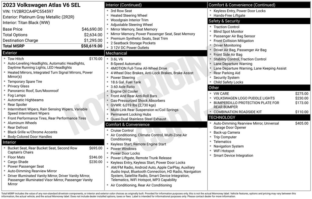 2023 Volkswagen Atlas SEL Certified. Platinum Gray Metallic SEL AWD 8-Speed Automatic with Tiptronic 3.6L V6 Volkswagen Certified, 2nd-Row Dual Captain's Chairs, 3.60 Axle Ratio, 3rd row seats: split-bench, 4-Wheel Disc Brakes, 6 Speakers, ABS brakes, Air Conditioning, Alloy wheels, AM/FM radio: SiriusXM with 360L, Auto High-beam Headlights, Auto-Dimming Rear-View Mirror, Auto-dimming Rear-View mirror, Automatic temperature control, Brake assist, Bumperdillo Protection Plate for Rear Bumper, Bumpers: body-color, Compass, Delay-off headlights, Driver door bin, Driver vanity mirror, Dual front impact airbags, Dual front side impact airbags, Electronic Stability Control, Emergency communication system: VW Car-Net Safe & Secure 5-year, Exterior Parking Camera Rear, First Aid Kit, Four wheel independent suspension, Front anti-roll bar, Front Bucket Seats, Front Center Armrest, Front dual zone A/C, Front fog lights, Front reading lights, Fully automatic headlights, Heated Comfort Front Bucket Seats, Heated door mirrors, Heated front seats, Heated steering wheel, Heavy Duty Trunk Liner w/VW CarGo Blocks, Illuminated entry, Leather Shift Knob, Low tire pressure warning, Memory seat, Navigation System, Occupant sensing airbag, Outside temperature display, Overhead airbag, Overhead console, Panic alarm, Passenger door bin, Passenger vanity mirror, Perforated V-Tex Leatherette Seating Surfaces, Power door mirrors, Power driver seat, Power Liftgate, Power moonroof: Panoramic, Power passenger seat, Power steering, Power windows, Privacy Cover, Radio data system, Radio: MIB3 Discover Media w/8" Touchscreen Nav, Rain sensing wipers, Rear air conditioning, Rear anti-roll bar, Rear reading lights, Rear seat center armrest, Rear window defroster, Rear window wiper, Remote keyless entry, Roadside Assistance Kit, Rubber Mats Kit - Captain's Chairs, Security system, Speed control, Speed-sensing steering, Split folding rear seat, Spoiler, Standard Suspension, Steering wheel mounted audio controls, Tachometer, Telescoping steering wheel, Tilt steering wheel, Traction control, Trailer Hitch Extras, Trip computer, Turn signal indicator mirrors, Variably intermittent wipers, Volkswagen Logo Puddle Lights, VW Care, Wheels: 20" x 8J 5-Spoke 2-Tone Machined Alloy.