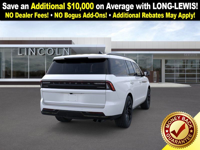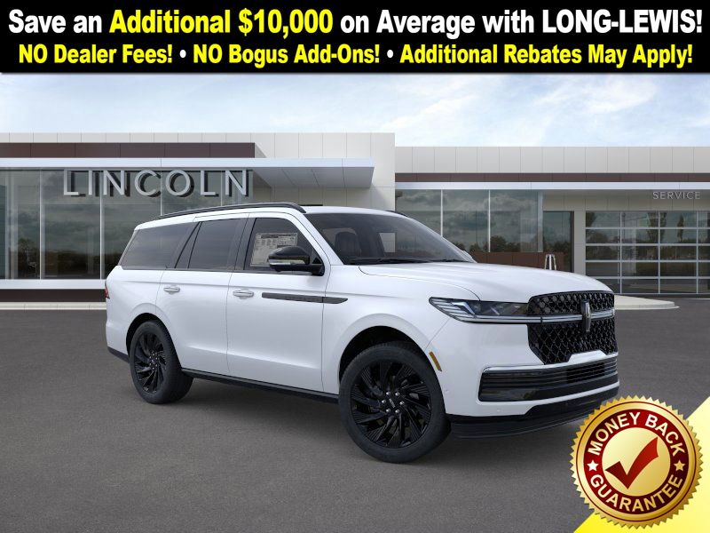 Dealer Discount of $4,414 off MSRP Pristine White Metallic Tri-Coat 2025 Lincoln Navigator Reserve NLT 4WD 10-Speed Automatic 3.5L V6 4WD, Lthr St Sur Blk Onyx Jet Leather, 26mm Engine Radiator, 28 Speakers, 2nd Row Heated & Ventilated Dual Captain's Chair, 3rd row seats: split-bench, 4-Wheel Disc Brakes, ABS brakes, Adaptive suspension, Adjustable pedals, Air Conditioning, Alloy wheels, AM/FM radio: SiriusXM with 360L, Apple CarPlay/Android Auto, Audio memory, Auto High-beam Headlights, Auto Htd & Ventilated Premium Lthr Captain's Chair, Auto Start-Stop Technology, Auto tilt-away steering wheel, Auto-dimming door mirrors, Auto-dimming Rear-View mirror, Auto-leveling suspension, Automatic temperature control, Black Accent Badge, Black Accent Interior Pack, Black Beltline Molding, Black Painted Roof Rails, Brake assist, Bumpers: body-color, Compass, Delay-off headlights, Driver door bin, Driver vanity mirror, Driver's Seat Mounted Armrest, Dual front impact airbags, Dual front side impact airbags, Electronic Stability Control, Emergency communication system: 911 Assist, Exterior Parking Camera Rear, Four wheel independent suspension, Front anti-roll bar, Front Bucket Seats, Front Bumper Fascia, Front dual zone A/C, Front reading lights, Fully automatic headlights, Garage door transmitter, Heated door mirrors, Heated front seats, Heated rear seats, Heated steering wheel, Heavy-Duty Trailer Tow Package, HVAC memory, Illuminated entry, Jet Appearance Package, Leather steering wheel, Lincoln Connect, Lincoln Lit Star, Lincoln Premium Connectivity, Low tire pressure warning, Memory seat, Navigation system: Connected Navigation (1-year trial), Occupant sensing airbag, Outside temperature display, Overhead airbag, Overhead console, Panic alarm, Passenger door bin, Passenger seat mounted armrest, Passenger vanity mirror, Pedal memory, Power adjustable rear head restraints, Power door mirrors, Power driver seat, Power moonroof: Panoramic Vista Roof, Power passenger seat, Power steering, Power windows, Radio data system, Radio: Revel Ultima 3D AM/FM/HD Audio System, Rain sensing wipers, Rear air conditioning, Rear anti-roll bar, Rear audio controls, Rear reading lights, Rear window defroster, Rear window wiper, Reclining 3rd row seat, Remote keyless entry, Security system, SiriusXM w/360L, Speed control, Speed-sensing steering, Speed-Sensitive Wipers, Split folding rear seat, Spoiler, Steering wheel memory, Steering wheel mounted audio controls, Tachometer, Telescoping steering wheel, Tilt steering wheel, Traction control, Trailer Brake Controller, Trip computer, Turn signal indicator mirrors, Unique Lincoln Grille Pillar Black Surround, Variably intermittent wipers, Ventilated front seats, Wheels: 22" Dark Tarnished Aluminum, Wheels: 22" High-Gloss Ebony Aluminum, 4WD, Lthr St Sur Blk Onyx Jet Leather. Price includes: $1000 - Bonus Cash. Exp. 03/31/2026 $5000 - Retail Customer Cash. Exp. 03/31/2026
