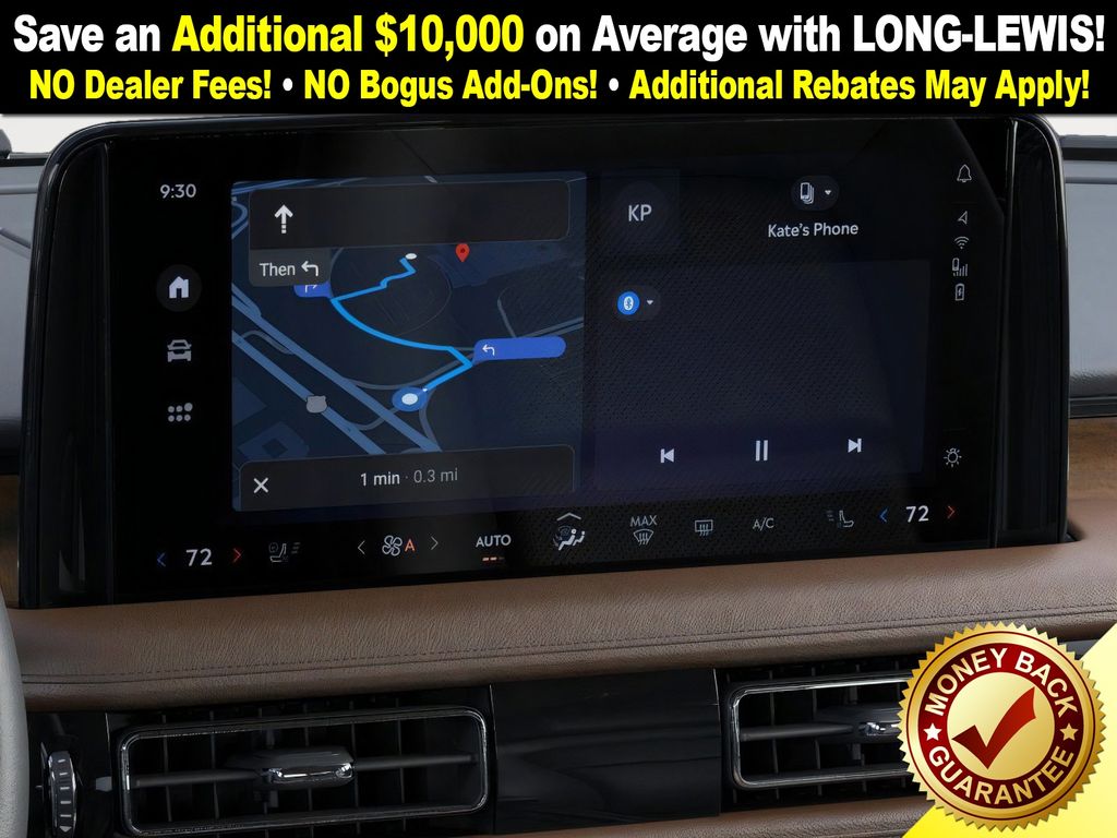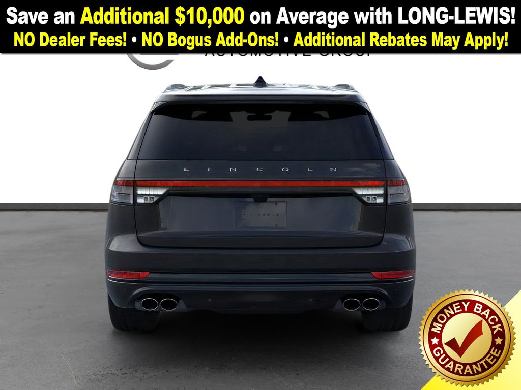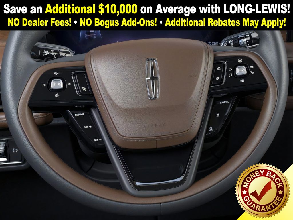 Lincoln Connectivity Package (4-years included), 14 Speakers, 3rd row seats: split-bench, 4-Wheel Disc Brakes, 40/Mini Console/40 Dual Captain's Chairs, ABS brakes, Adaptive suspension, Advanced Heads-Up Display, Air Conditioning, Alloy wheels, AM/FM radio: SiriusXM, Apple CarPlay/Android Auto, Audio memory, Auto Air Refresh, Auto High-beam Headlights, Auto-dimming door mirrors, Auto-dimming Rear-View mirror, Automatic temperature control, Brake assist, Bumpers: body-color, Compass, Delay-off headlights, Driver door bin, Driver vanity mirror, Dual front impact airbags, Dual front side impact airbags, Electronic Stability Control, Emergency communication system: 911 Assist, Exterior Parking Camera Rear, Four wheel independent suspension, Front anti-roll bar, Front Bucket Seats, Front Center Armrest, Front dual zone A/C, Front reading lights, Fully automatic headlights, Garage door transmitter, Genuine wood console insert, Genuine wood dashboard insert, Heads-Up Display, Heated door mirrors, Heated front seats, Heated steering wheel, HVAC memory, Illuminated entry, Knee airbag, Leather steering wheel, Lincoln BlueCruise Equipped (4-Years Included), Lincoln Digital Experience, Low tire pressure warning, Memory seat, Navigation System, Occupant sensing airbag, Outside temperature display, Overhead airbag, Overhead console, Panic alarm, Passenger door bin, Passenger vanity mirror, Power door mirrors, Power driver seat, Power Liftgate, Power moonroof: Panoramic Vista Roof, Power passenger seat, Power steering, Power windows, Premium Lthr Heated/Ventilated Fnt Captain's Chairs, Radio data system, Radio: Revel Audio System w/14 Speakers, Rain sensing wipers, Rear air conditioning, Rear anti-roll bar, Rear audio controls, Rear dual zone A/C, Rear reading lights, Rear window defroster, Rear window wiper, Remote keyless entry, Security system, SiriusXM, Speed control, Speed-Sensitive Wipers, Split folding rear seat, Spoiler, Steering wheel memory, Steering wheel mounted A/C controls, Steering wheel mounted audio controls, Tachometer, Telescoping steering wheel, Tilt steering wheel, Traction control, Trip computer, Turn signal indicator mirrors, Variably intermittent wipers, Ventilated front seats, Wheels: 21" Bright-Machined Aluminum, and Wireless Charging Pad.