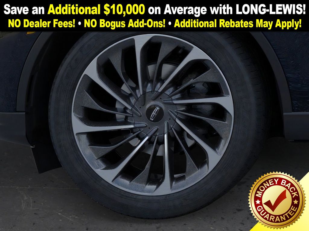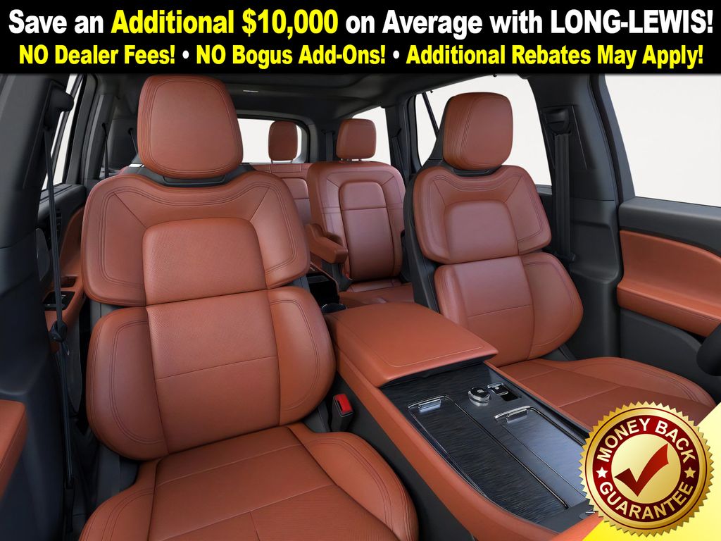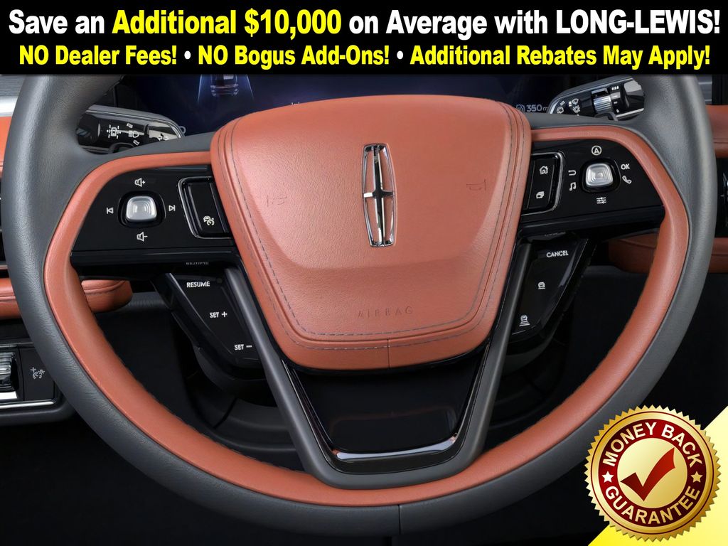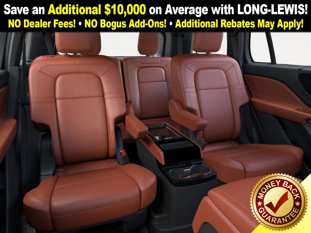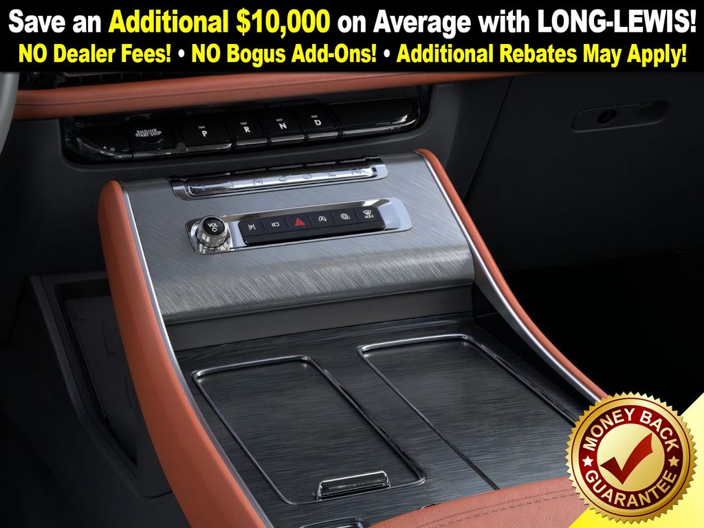 Lincoln Connectivity Package (4-years included), 14 Speakers, 3rd row seats: split-bench, 4-Wheel Disc Brakes, 40/Mini Console/40 Dual Captain's Chairs, ABS brakes, Adaptive suspension, Advanced Heads-Up Display, Air Conditioning, Alloy wheels, AM/FM radio: SiriusXM, Apple CarPlay/Android Auto, Audio memory, Auto Air Refresh, Auto High-beam Headlights, Auto-dimming door mirrors, Auto-dimming Rear-View mirror, Automatic temperature control, Brake assist, Bumpers: body-color, Compass, Delay-off headlights, Driver door bin, Driver vanity mirror, Dual front impact airbags, Dual front side impact airbags, Electronic Stability Control, Emergency communication system: 911 Assist, Exterior Parking Camera Rear, Four wheel independent suspension, Front anti-roll bar, Front Bucket Seats, Front Center Armrest, Front dual zone A/C, Front reading lights, Fully automatic headlights, Garage door transmitter, Genuine wood console insert, Genuine wood dashboard insert, Heads-Up Display, Heated door mirrors, Heated front seats, Heated steering wheel, HVAC memory, Illuminated entry, Knee airbag, Leather steering wheel, Lincoln BlueCruise Equipped (4-Years Included), Lincoln Digital Experience, Low tire pressure warning, Memory seat, Navigation System, Occupant sensing airbag, Outside temperature display, Overhead airbag, Overhead console, Panic alarm, Passenger door bin, Passenger vanity mirror, Power door mirrors, Power driver seat, Power Liftgate, Power moonroof: Panoramic Vista Roof, Power passenger seat, Power steering, Power windows, Premium Lthr Heated/Ventilated Fnt Captain's Chairs, Radio data system, Radio: Revel Audio System w/14 Speakers, Rain sensing wipers, Rear air conditioning, Rear anti-roll bar, Rear audio controls, Rear dual zone A/C, Rear reading lights, Rear window defroster, Rear window wiper, Remote keyless entry, Security system, SiriusXM, Speed control, Speed-Sensitive Wipers, Split folding rear seat, Spoiler, Steering wheel memory, Steering wheel mounted A/C controls, Steering wheel mounted audio controls, Tachometer, Telescoping steering wheel, Tilt steering wheel, Traction control, Trip computer, Turn signal indicator mirrors, Variably intermittent wipers, Ventilated front seats, Wheels: 21" Bright-Machined Aluminum, and Wireless Charging Pad.