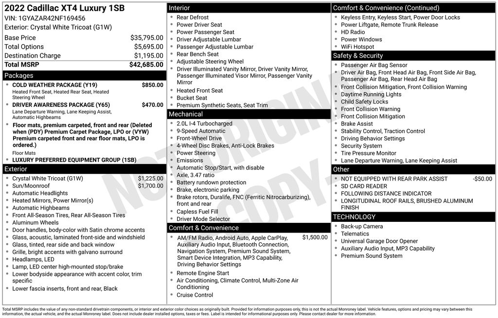 2022 Cadillac XT4 Luxury Crystal White Tricoat Luxury FWD 9-Speed Automatic 2.0L I4 Turbocharged 2-Way Driver Seat Power Lumbar Control, 2-Way Passenger Seat Power Lumbar Control, 3.47 Axle Ratio, 4-Wheel Disc Brakes, 6-Way Power Passenger Seat Adjuster, 7 Speakers, 7-Speaker Audio System w/Auxiliary Amplifier, 8-Way Power Driver Seat Adjuster, ABS brakes, Air Conditioning, Alloy wheels, AM/FM radio: SiriusXM with 360L, Apple CarPlay/Android Auto, Automatic temperature control, Bose Centerpoint Surround Sound 13-Speaker System, Brake assist, Brushed Aluminum Finish Longitudinal Roof Rails, Bumpers: body-color, Cold Weather Package, Compass, Delay-off headlights, Driver Awareness Package, Driver door bin, Driver vanity mirror, Dual front impact airbags, Dual front side impact airbags, Dual Panel Glass Sunroof w/Power Tilt/Sliding, Electronic Stability Control, Emergency communication system: OnStar and Cadillac connected services capable, Following Distance Indicator, Four wheel independent suspension, Front anti-roll bar, Front Bucket Seats, Front Center Armrest, Front dual zone A/C, Front reading lights, Fully automatic headlights, Garage door transmitter, HD Radio, Heated door mirrors, Heated Driver & Front Passenger Seats, Heated Rear Outboard Seating Positions, Heated Steering Wheel, Illuminated entry, IntelliBeam Automatic High Beam Control, Inteluxe Seats, Knee airbag, Lane Keep Assist w/Lane Departure Warning, Leather steering wheel, Low tire pressure warning, Not Equipped w/Rear Park Assist, Occupant sensing airbag, Outside temperature display, Overhead airbag, Overhead console, Panic alarm, Passenger door bin, Passenger vanity mirror, Power door mirrors, Power driver seat, Power Liftgate, Power passenger seat, Power steering, Power windows, Preferred Equipment Group 1SB, Radio data system, Radio: Cadillac User Experience AM/FM Stereo, Radio: Cadillac User Experience w/Embedded Nav, Rear anti-roll bar, Rear reading lights, Rear seat center armrest, Rear window defroster, Rear window wiper, Remote keyless entry, SD Card Reader, Security system, SiriusXM w/360L, Speed control, Speed-sensing steering, Split folding rear seat, Spoiler, Standard Suspension, Steering wheel mounted audio controls, Tachometer, Telescoping steering wheel, Tilt steering wheel, Traction control, Trip computer, Variably intermittent wipers, Voltmeter, Wheels: 18" 10-Spoke Bright Silver Finish Alloy, Wireless Apple CarPlay/Wireless Android Auto.