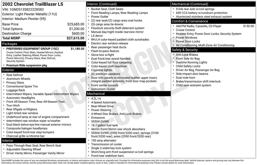 2002 Chevrolet Trailblazer LS SUV Vortec 4200 I6 MPI DOHC
