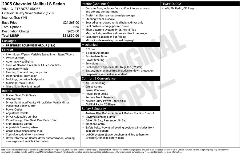 2005 Chevrolet Malibu with a 3.5L V6 engine is a midsize sedan that provides a solid balance of power and comfort. Here are some key details about it:Fuel Economy: Roughly 20-25 MPG depending on driving conditions, with city driving lower and highway driving higher.Comfort: Decent interior space for the class. Features like air conditioning, cruise control, power windows, and a CD player are standard. Higher trims might offer leather upholstery, power-adjustable seats, and a sunroof.