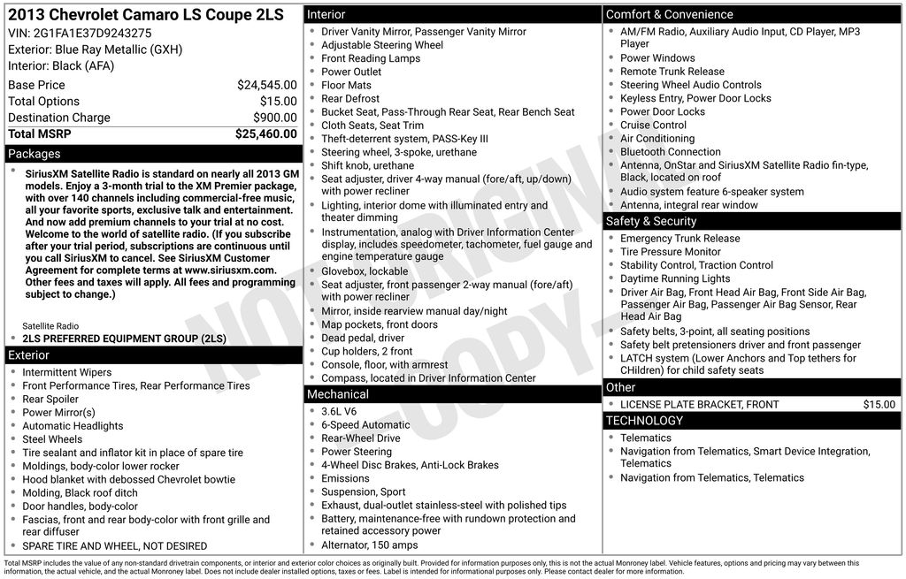 2013 Chevrolet Camaro 2LS **Here at Long-Lewis we believe in being transparent. We have no Doc fees, or any other hidden fees. We are a one price store and give our best price up front and they are clearly marked on all our inventory.** Blue Ray Metallic RWD 6-Speed Automatic with TapShift 3.6L V6 DGI DOHC VVT
