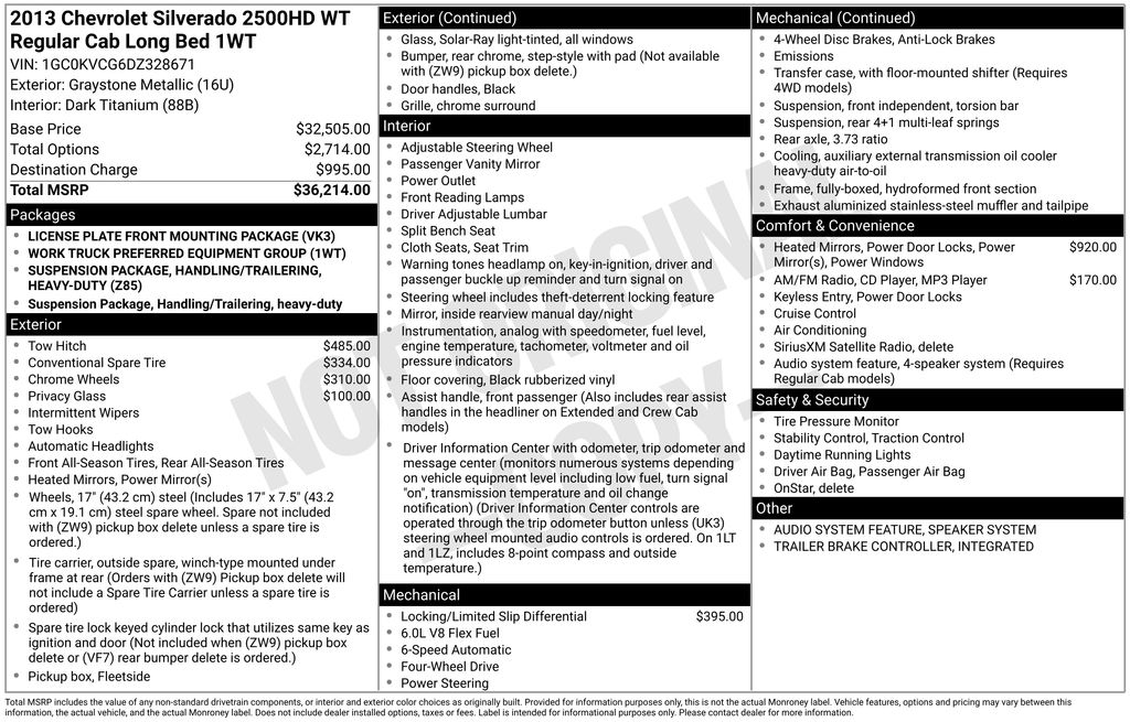 2013 Chevrolet Silverado 2500HD Work Truck Graystone Metallic Work Truck 4WD 6-Speed Automatic HD Electronic with Overdrive Vortec 6.0L V8 SFI Flex Fuel VVT 6-Speed Automatic HD Electronic with Overdrive, 4WD, Dark Titanium Cloth, 17" Chrome-Clad Steel Wheels, 3.73 Rear Axle Ratio, 4 Speakers, 4-Wheel Disc Brakes, ABS brakes, Air Conditioning, AM/FM radio, AM/FM Stereo w/Seek & Scan/Digital Clock, Brake assist, Bumpers: chrome, Delay-off headlights, Driver door bin, Driver-Side Manual Lumbar Control Seat Adjuster, Dual front impact airbags, Electronic Stability Control, Front 40/20/40 Split-Bench Seat, Front anti-roll bar, Front Center Armrest w/Storage, Front reading lights, Front wheel independent suspension, Fully automatic headlights, Heavy-Duty Handling/Trailering Suspension Package, Heavy-Duty Rear Automatic Locking Differential, Heavy-Duty Trailering Equipment (Retail), Integrated Trailer Brake Controller, Low tire pressure warning, Overhead console, Passenger cancellable airbag, Passenger door bin, Passenger vanity mirror, Power Door Locks, Power steering, Rear step bumper, Remote Keyless Entry, Solar-Ray Deep-Tinted Glass, Speed control, Tachometer, Tilt steering wheel, Traction control, Variably intermittent wipers, Vinyl Seat Trim, Voltmeter, Work Truck Package, 6-Speed Automatic HD Electronic with Overdrive, 4WD, Dark Titanium Cloth.