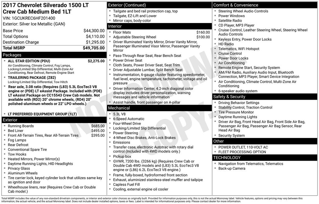 2017 Chevrolet Silverado 1500 LT LT1 Silver Ice Metallic LT LT1 4WD 6-Speed Automatic Electronic with Overdrive EcoTec3 5.3L V8 6-Speed Automatic Electronic with Overdrive, 4WD, Cocoa/Dune Cloth, 10-Way Power Driver's Seat Adjuster, 110-Volt AC Power Outlet, 150 Amp Alternator, 4-Wheel Disc Brakes, 4.2" Diagonal Color Display Driver Info Center, 4" Chrome Round Assist Steps (LPO), 40/20/40 Front Split Bench Seat, 6 Speaker Audio System, 6 Speakers, ABS brakes, Air Conditioning, All Star Edition, Alloy wheels, AM/FM radio: SiriusXM, Bluetooth® For Phone, Body Color Bodyside Moldings, Body-Color Door Handles, Body-Color Mirror Caps, Body-Color Power Adjustable Heated Outside Mirrors, Bodyside moldings, Brake assist, CD player, Cloth Seat Trim, Color-Keyed Carpeting w/Rubberized Vinyl Floor Mats, Compass, Deep-Tinted Glass, Delay-off headlights, Driver & Front Passenger Illuminated Vanity Mirrors, Driver door bin, Driver vanity mirror, Dual front impact airbags, Dual front side impact airbags, Dual-Zone Automatic Climate Control, Electric Rear-Window Defogger, Electronic Stability Control, Emergency communication system: OnStar Guidance, Exterior Parking Camera Rear, EZ Lift & Lower Tailgate, Front & Rear All-Weather Floor Mats, Front anti-roll bar, Front Center Armrest w/Storage, Front Chrome Bumper, Front reading lights, Front wheel independent suspension, Fully automatic headlights, HD Radio, Heated door mirrors, Heavy-Duty Rear Locking Differential, High-Intensity Discharge Headlights, Illuminated entry, Leather Wrapped Steering Wheel w/Cruise Controls, Low tire pressure warning, Manual Tilt Wheel Steering Column, Manual Tilt/Telescoping Steering Column, Occupant sensing airbag, OnStar 3 Months Guidance Plan, OnStar w/4G LTE, Outside temperature display, Overhead airbag, Overhead console, Panic alarm, Passenger door bin, Passenger vanity mirror, Power door mirrors, Power steering, Power windows, Power Windows w/Driver Express Up, Premium audio system: Chevrolet MyLink, Radio data system, Radio: AM/FM 8" Diagonal Color Touch Screen, Rear 60/40 Folding Bench Seat (Folds Up), Rear Chrome Bumper, Rear reading lights, Rear seat center armrest, Rear step bumper, Rear Vision Camera, Rear Wheelhouse Liners, Remote Keyless Entry, Remote keyless entry, Remote Locking Tailgate, Remote Vehicle Starter System, Single Slot CD/MP3 Player, SiriusXM Satellite Radio, Speed control, Speed-sensing steering, Split folding rear seat, Spray-On Pickup Box Bed Liner, Steering Wheel Audio Controls, Steering wheel mounted audio controls, Tachometer, Theft Deterrent System (Unauthorized Entry), Thin Profile LED Fog Lamps, Tilt steering wheel, Traction control, Trailering Package, Trip computer, Variably intermittent wipers, Voltmeter, 6-Speed Automatic Electronic with Overdrive, 4WD, Cocoa/Dune Cloth.
