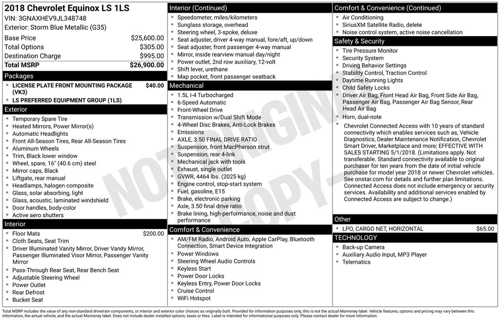 Recent Arrival! 17" Aluminum Wheels, 3.50 Final Drive Axle Ratio, 4-Way Manual Driver Seat Adjuster, 4-Wheel Disc Brakes, 6 Speaker Audio System Feature, 6 Speakers, ABS brakes, Air Conditioning, All-Weather Floor Liners (LPO), Alloy wheels, AM/FM radio, Apple CarPlay/Android Auto, Bluetooth® For Phone, Brake assist, Bumpers: body-color, Carpeted Rear Floor Mats, Compass, Delay-off headlights, Driver door bin, Driver vanity mirror, Dual front impact airbags, Dual front side impact airbags, Electronic Stability Control, Emergency communication system: OnStar and Chevrolet connected services capable, Exterior Parking Camera Rear, Four wheel independent suspension, Front anti-roll bar, Front Bucket Seats, Front Center Armrest, Front Passenger 4-Way Manual Seat Adjuster, Front reading lights, Fully automatic headlights, Horizontal Cargo Net (LPO), Illuminated entry, Low tire pressure warning, Mechanical Jack w/Tools, Occupant sensing airbag, Outside temperature display, Overhead airbag, Overhead console, Panic alarm, Passenger door bin, Passenger vanity mirror, Power door mirrors, Power steering, Power windows, Preferred Equipment Group 1LS, Premium audio system: Chevrolet MyLink, Premium Cloth Seat Trim, Radio data system, Radio: Chevrolet MyLink AM/FM Stereo, Rear anti-roll bar, Rear reading lights, Rear seat center armrest, Rear window defroster, Rear window wiper, Remote keyless entry, Security system, SiriusXM Satellite Radio Delete, Speed control, Speed-sensing steering, Split folding rear seat, Spoiler, Steering wheel mounted audio controls, Tachometer, Telescoping steering wheel, Tilt steering wheel, Traction control, Trip computer, USB Port & Auxiliary Input Jack, Variably intermittent wipers.