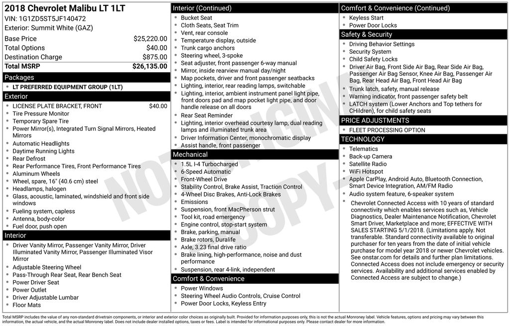2018 Chevrolet Malibu LT FWD 6-Speed Automatic 1.5L DOHC Summit White