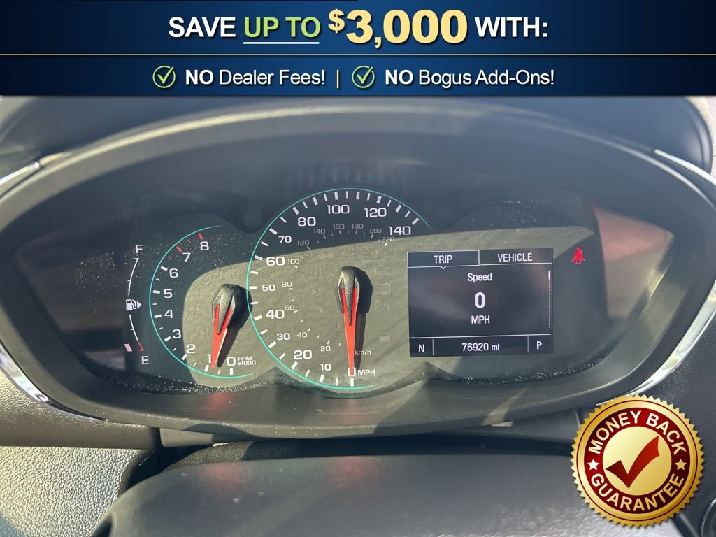 16 Aluminum Wheels, 2 Spare Keys Key System, 2 USB Ports w/Auxiliary Input Jack, 2-Way Manual Front Passenger Seat Adjuster, 3-Spoke Leather-Wrapped Steering Wheel, 3.53 Final Drive Axle Ratio, 4-Way Manual Driver Seat Adjuster, 6 Speakers, 6-Speaker Audio System Feature, 6-Way Power Driver Seat Adjuster, ABS brakes, Air Conditioning, Alloy wheels, AM/FM radio: SiriusXM, Apple CarPlay/Android Auto, Body-Color Door Handles w/Chrome Accent, Brake assist, Bumpers: body-color, Compass, Delay-off headlights, Deluxe Cloth Seat Trim, Deluxe Cloth/Leatherette Seat Trim, Driver door bin, Driver vanity mirror, Driver's Seat Mounted Armrest, Dual front impact airbags, Dual front side impact airbags, Electronic Stability Control, Emergency communication system: OnStar and Chevrolet connected services capable, Exterior Parking Camera Rear, Front anti-roll bar, Front Bucket Seats, Front Bucket Seats w/Driver Power Lumbar, Front License Plate Bracket, Front reading lights, Front wheel independent suspension, Fully automatic headlights, Heated door mirrors, Illuminated entry, Keyless Open w/Panic Alarm, Keyless Start, Knee airbag, Low tire pressure warning, LT Convenience Package, Occupant sensing airbag, Outside temperature display, Overhead airbag, Panic alarm, Passenger door bin, Passenger vanity mirror, Power door mirrors, Power steering, Power windows, Preferred Equipment Group 1LT, Premium audio system: Chevrolet MyLink, Radio data system, Radio: Chevrolet Infotainment 3 System, Rear seat center armrest, Rear side impact airbag, Rear window defroster, Rear window wiper, Remote keyless entry, Roof rack: rails only, Security system, SiriusXM Radio, Speed control, Speed-sensing steering, Split folding rear seat, Spoiler, Steering wheel mounted audio controls, Tachometer, Telescoping steering wheel, Tilt steering wheel, Traction control, Trip computer, Variably intermittent wipers.