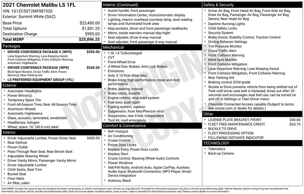 2021 Chevrolet Malibu LS FWD CVT 1.5L DOHC Summit White