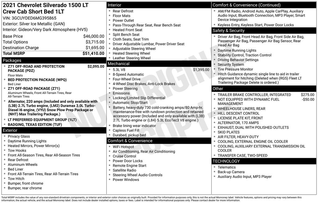2021 Chevrolet Silverado 1500 LT Texas Edition Silver Ice Metallic LT Texas Edition 4WD 8-Speed Automatic EcoTec3 5.3L V8 8-Speed Automatic, 4WD, Gideon/Very Dark Atmosphere Cloth, 10-Way Power Driver Seat w/Lumbar, 12-Volt Rear Auxiliary Power Outlet, 170 Amp Alternator, 2 USB Ports (First Row), 220 Amp Alternator, 3.23 Rear Axle Ratio, 4-Wheel Disc Brakes, 4.2" Diagonal Color Display Driver Info Center, 40/20/40 Front Split-Bench Seat, 4G LTE Wi-Fi Hot Spot Capable, 6 Speakers, ABS brakes, Air Conditioning, All-Star Edition, All-Weather Floor Liner (LPO) (AAK), Alloy wheels, AM/FM radio: SiriusXM, Apple CarPlay/Android Auto, Auto-Locking Rear Differential, Automatic temperature control, Auxiliary External Transmission Oil Cooler, Bed Protection Package, Bluetooth® For Phone, Brake assist, Bumpers: chrome, Chevrolet Connected Access Capable, Chevytec Spray-On Black Bedliner, Chrome Grille, Chrome Mirror Caps, Cloth Seat Trim, Color-Keyed Carpeting Floor Covering, Compass, Convenience Package, Deep-Tinted Glass, Delay-off headlights, Driver door bin, Driver vanity mirror, Dual Exhaust w/Polished Outlets, Dual front impact airbags, Dual front side impact airbags, Dual-Zone Automatic Climate Control, Electric Rear-Window Defogger, Electrical Lock Control Steering Column, Electronic Cruise Control, Electronic Stability Control, External Engine Oil Cooler, EZ Lift Power Lock & Release Tailgate, Front anti-roll bar, Front Center Armrest w/Storage, Front dual zone A/C, Front Frame-Mounted Black Recovery Hooks, Front License Plate Kit, Front reading lights, Front Rubberized Vinyl Floor Mats, Front wheel independent suspension, Fully automatic headlights, Heated door mirrors, Heated Driver & Front Outboard Passenger Seats, Heated front seats, Heated Steering Wheel, Heated steering wheel, Heavy Duty Suspension, Heavy-Duty Air Filter, Hill Descent Control, Hitch Guidance, Illuminated entry, Integrated Trailer Brake Controller, Keyless Open & Start, Leather Wrapped Steering Wheel, LED Cargo Area Lighting, Low tire pressure warning, Manual Tilt/Telescoping Steering Column, Not Equipped w/Dynamic Fuel Management, Occupant sensing airbag, OnStar & Chevrolet Connected Services Capable, Outside temperature display, Overhead airbag, Overhead console, Panic alarm, Passenger door bin, Passenger vanity mirror, Power Door Locks, Power door mirrors, Power driver seat, Power Front Windows w/Driver Express Up/Down, Power Front Windows w/Passenger Express Down, Power Rear Windows w/Express Down, Power steering, Power windows, Preferred Equipment Group 1LT, Premium audio system: Chevrolet Infotainment 3, Radio data system, Radio: Chevrolet Infotainment 3 System, Rear 60/40 Folding Bench Seat (Folds Up), Rear Dual USB Charging-Only Ports, Rear reading lights, Rear Rubberized-Vinyl Floor Mats, Rear step bumper, Rear Vision Camera, Rear Wheelhouse Liners, Rear window defroster, Remote keyless entry, Remote Vehicle Starter System, Security system, SiriusXM Radio, Speed control, Speed-sensing steering, Split folding rear seat, Standard Tailgate, Steering Wheel Audio Controls, Steering wheel mounted audio controls, Tachometer, Telescoping steering wheel, Texas Edition Badging, Theft Deterrent System (Unauthorized Entry), Tilt steering wheel, Traction control, Trailering Package, Trip computer, Variably intermittent wipers, Voltmeter, Wheels: 17" x 8" Bright Silver Painted Aluminum, Wheels: 18" x 8.5" Bright Silver Painted Aluminum, Z71 Off-Road & Protection Package, Z71 Off-Road Package, 8-Speed Automatic, 4WD, Gideon/Very Dark Atmosphere Cloth.