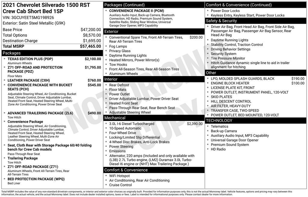 2021 Chevrolet Silverado 1500 RST 4WD with the 3.0-liter 6-cylinder diesel (Duramax I-6) one of the more popular choices if you want better fuel economy with decent torque and towing capability:This Duramax diesel is known for strong low-end torque and excellent highway fuel economy compared with gas V-8s one of the main reasons many buyers choose it.Real-world fuel economy varies widely with driving style and load some diesel owners report mid-20s around town and 30+ mpg on highway when not towing.