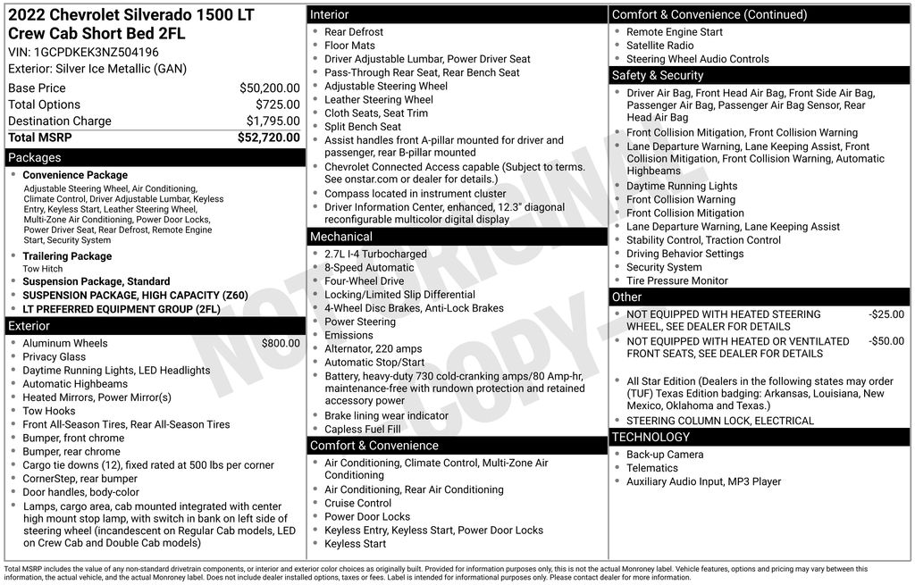 2022 Chevrolet Silverado 1500 LT Silver Ice Metallic LT 4WD 8-Speed Automatic 2.7L Turbo 8-Speed Automatic, 4WD, Black Cloth, 10-Way Power Driver Seat w/Lumbar, 12.3" Multicolor Reconfigurable Digital Display, 120-Volt Bed Mounted Power Outlet, 120-Volt Instrument Panel Power Outlet, 3.42 Rear Axle Ratio, 4-Wheel Disc Brakes, 40/20/40 Front Split-Bench Seat, 6 Speakers, 6-Speaker Audio System, ABS brakes, Air Conditioning, All-Star Edition, Alloy wheels, AM/FM radio: SiriusXM with 360L, Apple CarPlay/Android Auto, Auto High-beam Headlights, Auto-Locking Rear Differential, Automatic Emergency Braking, Automatic temperature control, Bluetooth® For Phone, Brake assist, Bumpers: chrome, Chevrolet Connected Access Capable, Chrome Mirror Caps, Cloth Seat Trim, Color-Keyed Carpeting Floor Covering, Compass, Convenience Package, Deep-Tinted Glass, Delay-off headlights, Driver door bin, Driver vanity mirror, Dual front impact airbags, Dual front side impact airbags, Dual Rear USB Ports (Charge Only), Dual-Zone Automatic Climate Control, Electric Rear-Window Defogger, Electrical Steering Column Lock, Electronic Cruise Control, Electronic Stability Control, Following Distance Indicator, Forward Collision Alert, Front anti-roll bar, Front Center Armrest w/Storage, Front dual zone A/C, Front Frame-Mounted Black Recovery Hooks, Front Pedestrian Braking, Front reading lights, Front wheel independent suspension, Fully automatic headlights, HD Rear Vision Camera, Heated door mirrors, Heated Driver & Front Outboard Passenger Seats, Heated front seats, Heated Steering Wheel, Heated steering wheel, High Capacity Suspension Package, Hitch Guidance, Illuminated entry, IntelliBeam Automatic High Beam On/Off, Keyless Open & Start, Lane Keep Assist w/Lane Departure Warning, Leather Wrapped Steering Wheel, LED Cargo Area Lighting, Low tire pressure warning, Manual Tilt/Telescoping Steering Column, Not Equipped w/Heated Steering Wheel (DISC), Not Equipped w/Heated/Ventilated Front Seats, Occupant sensing airbag, OnStar & Chevrolet Connected Services Capable, Outside temperature display, Overhead airbag, Overhead console, Panic alarm, Passenger door bin, Passenger vanity mirror, Power door mirrors, Power driver seat, Power Front Windows w/Driver Express Up/Down, Power Front Windows w/Passenger Express Down, Power Rear Windows w/Express Down, Power steering, Power windows, Premium audio system: Chevrolet Infotainment 3 Premium, Radio data system, Radio: Chevrolet Infotainment 3 Premium System, Rear 60/40 Folding Bench Seat (Folds Up), Rear reading lights, Rear step bumper, Rear window defroster, Remote keyless entry, Remote Vehicle Starter System, Security system, SiriusXM w/360L, Speed control, Speed-sensing steering, Split folding rear seat, Standard Suspension Package, Steering Wheel Audio Controls, Steering wheel mounted audio controls, Tachometer, Telescoping steering wheel, Theft Deterrent System (Unauthorized Entry), Tilt steering wheel, Traction control, Trailering Package, Trip computer, Variably intermittent wipers, Voltmeter, Wheels: 18" x 8.5" Bright Silver Painted Aluminum, Wheels: 20" x 9" Painted Aluminum, Wi-Fi Hot Spot Capable, Wireless Phone Projection, 8-Speed Automatic, 4WD, Black Cloth.