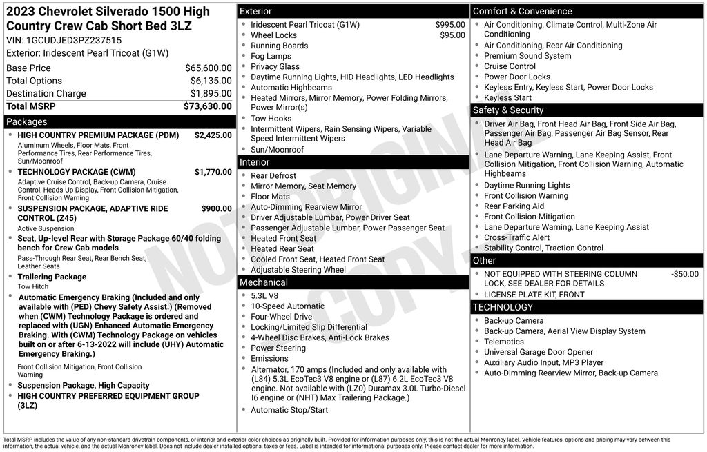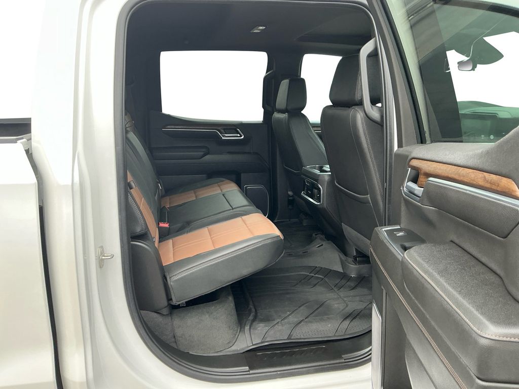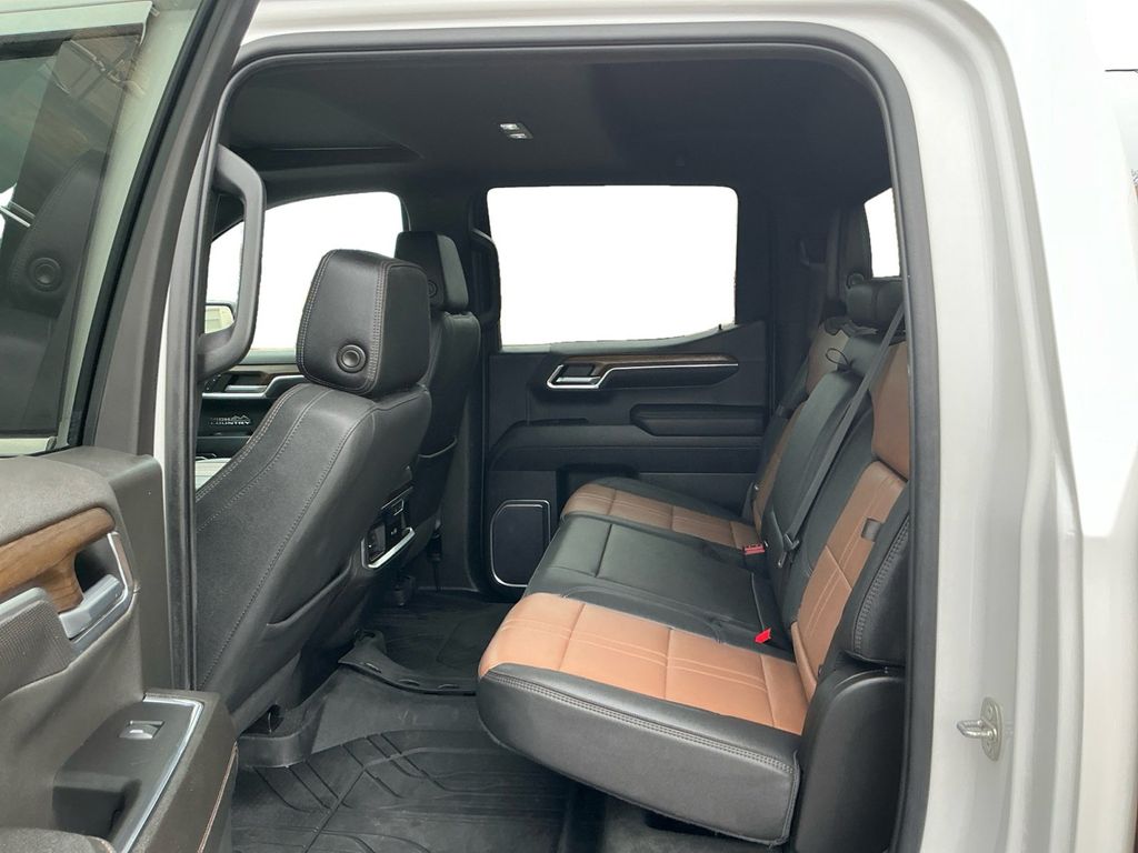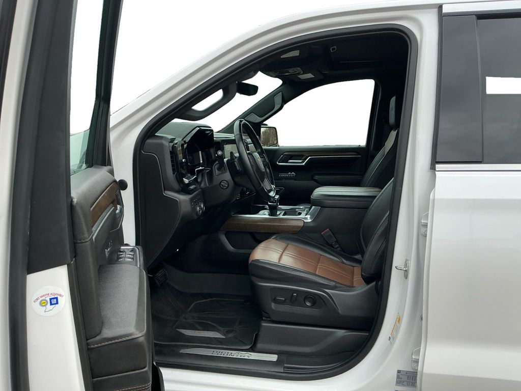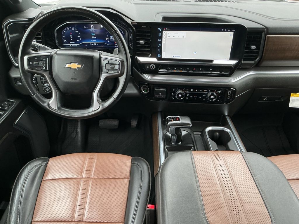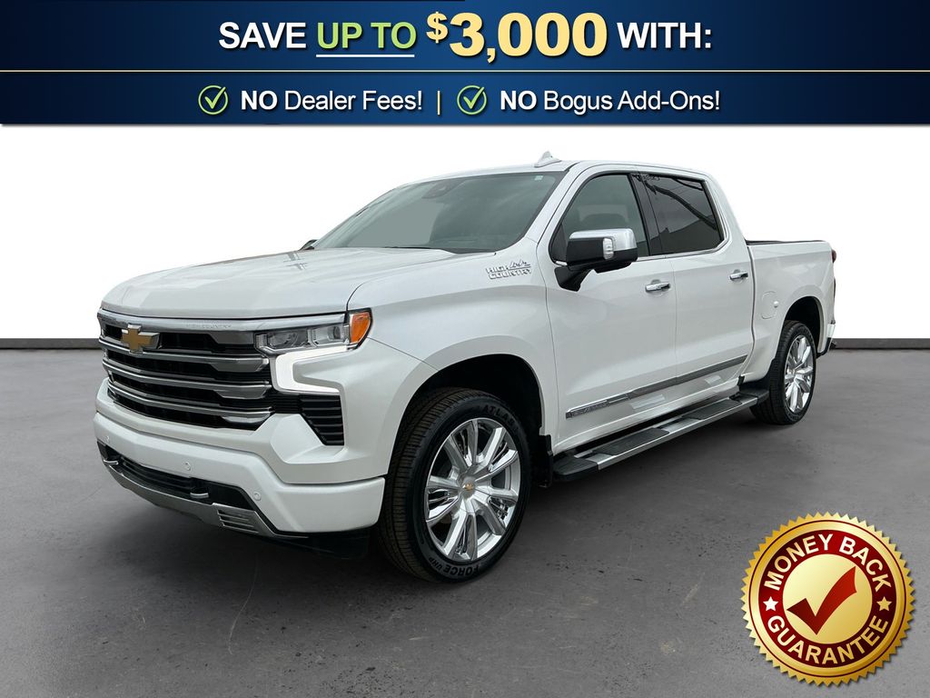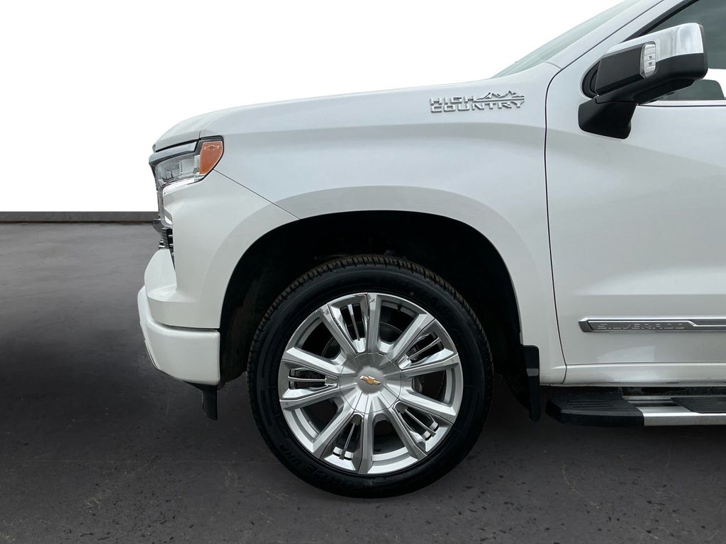 2023 Chevrolet Silverado 1500 High Country Iridescent Pearl Tricoat High Country 4WD 10-Speed Automatic EcoTec3 5.3L V8 10-Speed Automatic, 4WD, Jet Black/Umber Leather, 10-Way Power Driver Seat w/Lumbar, 10-Way Power Passenger Seat Adjuster w/Lumbar, 12.3" Multicolor Reconfigurable Digital Display, 120-Volt Bed Mounted Power Outlet, 120-Volt Instrument Panel Power Outlet, 15" Diagonal Multicolor Head-Up Display, 170 Amp Alternator, 2 USB Data Ports, 2nd Row Heated Outboard Seats, 3.23 Rear Axle Ratio, 4-Wheel Disc Brakes, 7 Speakers, ABS brakes, Adaptive Cruise Control, Adaptive Ride Control Suspension, Air Conditioning, All-Weather Floor Liner (LPO), Alloy wheels, AM/FM radio: SiriusXM with 360L, Apple CarPlay/Android Auto, Auto High-beam Headlights, Auto-dimming door mirrors, Auto-Dimming Inside Rear-View Mirror, Auto-dimming Rear-View mirror, Auto-Locking Rear Differential, Automatic Emergency Braking, Automatic temperature control, Bed View Camera, Bluetooth® For Phone, Body-Color Painted Mirror Caps, Bodyside moldings, Brake assist, Bumpers: body-color, Chevrolet Connected Access Capable, Chevytec Spray-On Black Bedliner, Chrome Assist Steps, Chrome Recovery Hooks, Color-Keyed Carpeting Floor Covering, Compass, Deep-Tinted Glass, Delay-off headlights, Driver door bin, Driver Memory, Driver vanity mirror, Dual Exhaust w/Polished Outlets, Dual front impact airbags, Dual front side impact airbags, Dual Rear USB Ports (Charge Only), Electric Rear-Window Defogger, Electrical Steering Column Lock, Electronic Cruise Control, Electronic Stability Control, Electronic Transmission Range Selector Shifter, Floor Mounted Center Console, Following Distance Indicator, Forward Collision Alert, Front anti-roll bar, Front Bucket Seats, Front Carpeted Floor Mats, Front Center Armrest, Front dual zone A/C, Front fog lights, Front LED Fog Lamps, Front License Plate Kit, Front Pedestrian Braking, Front Rainsensing Wipers, Front reading lights, Front wheel independent suspension, Fully automatic headlights, Garage door transmitter, Genuine wood console insert, Genuine wood dashboard insert, Genuine wood door panel insert, HD Surround Vision, Heated door mirrors, Heated Driver & Front Outboard Passenger Seats, Heated front seats, Heated rear seats, Heated Steering Wheel, Heated steering wheel, High Capacity Suspension Package, High Country Premium Package, Hitch Guidance, Hitch Guidance w/Hitch View, Illuminated entry, Integrated Trailer Brake Controller, IntelliBeam Automatic High Beam On/Off, Keyless Open & Start, Lane Keep Assist w/Lane Departure Warning, LED Cargo Area Lighting, Low tire pressure warning, Memory seat, Not Equipped w/Steering Column Lock, Occupant sensing airbag, OnStar & Chevrolet Connected Services Capable, Outside Heated Power-Adjustable Mirrors, Outside temperature display, Overhead airbag, Overhead console, Panic alarm, Passenger door bin, Passenger vanity mirror, Perforated Leather Seat Trim, Perimeter Lighting, Power door mirrors, Power driver seat, Power Front Passenger Windows w/Express Up/Down, Power Front Windows w/Driver Express Up/Down, Power passenger seat, Power Rear Windows w/Express Down, Power Sliding Rear Window w/Rear Defogger, Power steering, Power Sunroof, Power Tailgate, Power Tilt & Telescoping Steering Column, Power windows, Preferred Equipment Group 3LZ, Premium audio system: Chevrolet Infotainment 3 Premium, Premium Bose 7-Speaker Sound System, Radio data system, Radio: Chevrolet Infotainment 3 Premium System, Rain sensing wipers, Rear Camera Mirror, Rear Carpeted Floor Mats, Rear Cross Traffic Alert-Braking, Rear Pedestrian Alert, Rear reading lights, Rear seat center armrest, Rear step bumper, Rear Wheelhouse Liners, Rear window defroster, Remote keyless entry, Remote Vehicle Starter System, Safety Alert Seat, Security system, SiriusXM w/360L, Speed control, Speed-sensing steering, Split folding rear seat, Standard Tailgate, Steering Wheel Audio Controls, Steering wheel mounted audio controls, T