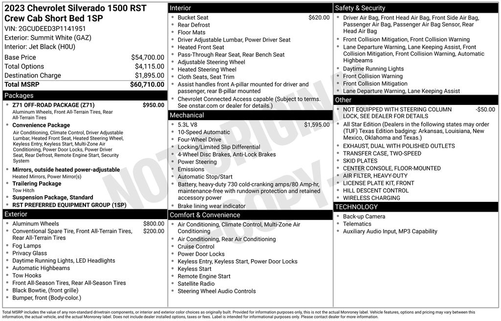 2023 Chevrolet Silverado 1500 RST Summit White RST 4WD 10-Speed Automatic EcoTec3 5.3L V8 10-Speed Automatic, 4WD, Black Cloth, 10-Way Power Driver Seat w/Lumbar, 12.3" Multicolor Reconfigurable Digital Display, 120-Volt Bed Mounted Power Outlet, 120-Volt Instrument Panel Power Outlet, 170 Amp Alternator, 2 USB Data Ports, 220 Amp Alternator, 3.23 Rear Axle Ratio, 4-Wheel Disc Brakes, 40/20/40 Front Split-Bench Seat, 6 Speakers, 6-Speaker Audio System, ABS brakes, Air Conditioning, All-Star Edition, Alloy wheels, AM/FM radio: SiriusXM with 360L, Apple CarPlay/Android Auto, Auto High-beam Headlights, Auto-Locking Rear Differential, Automatic Emergency Braking, Automatic temperature control, Auxiliary External Transmission Oil Cooler, Bluetooth® For Phone, Brake assist, Bumpers: body-color, Chevrolet Connected Access Capable, Cloth Seat Trim, Color-Keyed Carpeting Floor Covering, Compass, Convenience Package, Deep-Tinted Glass, Delay-off headlights, Driver door bin, Driver vanity mirror, Dual Exhaust w/Polished Outlets, Dual front impact airbags, Dual front side impact airbags, Dual Rear USB Ports (Charge Only), Dual-Zone Automatic Climate Control, Electric Rear-Window Defogger, Electrical Steering Column Lock, Electronic Cruise Control, Electronic Stability Control, Electronic Transmission Range Selector Shifter, External Engine Oil Cooler, EZ Lift Power Lock & Release Tailgate, Floor Mounted Center Console, Following Distance Indicator, Forward Collision Alert, Front anti-roll bar, Front Bucket Seats, Front Center Armrest w/Storage, Front dual zone A/C, Front fog lights, Front Frame-Mounted Black Recovery Hooks, Front LED Fog Lamps, Front License Plate Kit, Front Pedestrian Braking, Front reading lights, Front Rubberized Vinyl Floor Mats, Front wheel independent suspension, Fully automatic headlights, HD Rear Vision Camera, Heated door mirrors, Heated Driver & Front Outboard Passenger Seats, Heated front seats, Heated Power-Adjustable Outside Mirrors, Heated Steering Wheel, Heated steering wheel, Heavy-Duty Air Filter, High Capacity Suspension Package, High Gloss Black Mirror Caps, Hill Descent Control, Hitch Guidance, Illuminated entry, Inside Rear-View Mirror w/Tilt, IntelliBeam Automatic High Beam On/Off, Keyless Open & Start, Lane Keep Assist w/Lane Departure Warning, LED Cargo Area Lighting, Low tire pressure warning, Not Equipped w/Steering Column Lock, Occupant sensing airbag, Off-Road Suspension, OnStar & Chevrolet Connected Services Capable, Outside temperature display, Overhead airbag, Overhead console, Panic alarm, Passenger door bin, Passenger vanity mirror, Power door mirrors, Power driver seat, Power Front Windows w/Driver Express Up/Down, Power Front Windows w/Passenger Express Down, Power Rear Windows w/Express Down, Power steering, Power windows, Preferred Equipment Group 1SP, Premium audio system: Chevrolet Infotainment 3 Premium, Radio data system, Radio: Chevrolet Infotainment 3 Premium System, Rear 60/40 Folding Bench Seat (Folds Up), Rear reading lights, Rear Rubberized-Vinyl Floor Mats, Rear step bumper, Rear window defroster, Remote keyless entry, Remote Vehicle Starter System, Security system, SiriusXM w/360L, Speed control, Speed-sensing steering, Split folding rear seat, Standard Suspension Package, Standard Tailgate, Steering Wheel Audio Controls, Steering wheel mounted audio controls, Tachometer, Telescoping steering wheel, Theft Deterrent System (Unauthorized Entry), Tilt steering wheel, Traction control, Trailering Package, Trip computer, Variably intermittent wipers, Voltmeter, Wheels: 18" x 8.5" Bright Silver Painted Aluminum, Wheels: 20" x 9" High Gloss Black Painted Alum, Wi-Fi Hot Spot Capable, Wireless Charging, Wireless Phone Projection, Wrapped Steering Wheel, Z71 Off-Road Package, 10-Speed Automatic, 4WD, Black Cloth.