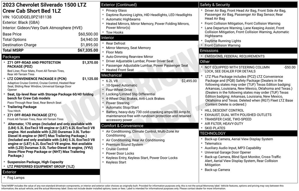 2023 Chevrolet Silverado 1500 LTZ Black LTZ 4WD 10-Speed Automatic EcoTec3 6.2L V8 10-Speed Automatic, 4WD, Gideon/Very Dark Atmosphere Leather, 10-Way Power Driver Seat w/Lumbar, 10-Way Power Passenger Seat Adjuster w/Lumbar, 12.3" Multicolor Reconfigurable Digital Display, 120-Volt Bed Mounted Power Outlet, 120-Volt Instrument Panel Power Outlet, 170 Amp Alternator, 2 USB Data Ports, 2nd Row Heated Outboard Seats, 3.23 Rear Axle Ratio, 4-Wheel Disc Brakes, 7 Speakers, ABS brakes, Adaptive Cruise Control, Air Conditioning, All-Weather Floor Liner (LPO) (AAK), Alloy wheels, AM/FM radio: SiriusXM with 360L, Apple CarPlay/Android Auto, Auto High-beam Headlights, Auto-dimming door mirrors, Auto-Dimming Inside Rear-View Mirror, Auto-dimming Rear-View mirror, Auto-Locking Rear Differential, Automatic Emergency Braking, Automatic temperature control, Bluetooth® For Phone, Brake assist, Bumpers: chrome, Chevrolet Connected Access Capable, Chevytec Spray-On Black Bedliner, Chrome Mirror Caps, Color-Keyed Carpeting Floor Covering, Compass, Deep-Tinted Glass, Delay-off headlights, Driver door bin, Driver Memory, Driver vanity mirror, Dual Exhaust w/Polished Outlets, Dual front impact airbags, Dual front side impact airbags, Dual Rear USB Ports (Charge Only), Electric Rear-Window Defogger, Electrical Steering Column Lock, Electronic Cruise Control, Electronic Stability Control, Electronic Transmission Range Selector Shifter, Floor Mounted Center Console, Following Distance Indicator, Forward Collision Alert, Front anti-roll bar, Front Bucket Seats, Front Center Armrest, Front dual zone A/C, Front fog lights, Front Frame-Mounted Black Recovery Hooks, Front LED Fog Lamps, Front Pedestrian Braking, Front Rainsensing Wipers, Front reading lights, Front Rubberized Vinyl Floor Mats, Front wheel independent suspension, Fully automatic headlights, HD Surround Vision, Heated door mirrors, Heated Driver & Front Outboard Passenger Seats, Heated front seats, Heated Steering Wheel, Heated steering wheel, Heavy-Duty Air Filter, High Capacity Suspension Package, Hill Descent Control, Hitch Guidance, Hitch Guidance w/Hitch View, Illuminated entry, Integrated Trailer Brake Controller, IntelliBeam Automatic High Beam On/Off, Keyless Open & Start, Lane Keep Assist w/Lane Departure Warning, LED Cargo Area Lighting, Low tire pressure warning, LTZ Convenience Package, LTZ Convenience Package II, LTZ Plus Package, Memory seat, Not Equipped w/Steering Column Lock, Occupant sensing airbag, Off-Road Suspension, OnStar & Chevrolet Connected Services Capable, Outside Heated Power-Adjustable Mirrors, Outside temperature display, Overhead airbag, Overhead console, Panic alarm, Passenger door bin, Passenger vanity mirror, Perforated Leather-Appointed Front Seat Trim, Perimeter Lighting, Power door mirrors, Power driver seat, Power Front Passenger Windows w/Express Up/Down, Power Front Windows w/Driver Express Up/Down, Power passenger seat, Power Rear Windows w/Express Down, Power Sliding Rear Window w/Rear Defogger, Power steering, Power Tailgate, Power Tilt & Telescoping Steering Column, Power windows, Preferred Equipment Group 1LZ, Premium audio system: Chevrolet Infotainment 3 Premium, Premium Bose 7-Speaker Sound System, Radio data system, Radio: Chevrolet Infotainment 3 Premium System, Rain sensing wipers, Rear Cross Traffic Alert-Braking, Rear Pedestrian Alert, Rear reading lights, Rear Rubberized-Vinyl Floor Mats, Rear seat center armrest, Rear step bumper, Rear Wheelhouse Liners, Rear window defroster, Remote keyless entry, Remote Vehicle Starter System, Safety Alert Seat, Safety Package, Security system, SiriusXM w/360L, Speed control, Speed-sensing steering, Split folding rear seat, Standard Tailgate, Steering Wheel Audio Controls, Steering wheel mounted audio controls, Tachometer, Telescoping steering wheel, Theft Deterrent System (Unauthorized Entry), Tilt steering wheel, Traction control, Trailer Camera Provisions, Trailer Side Blind Zone Alert, Traileri
