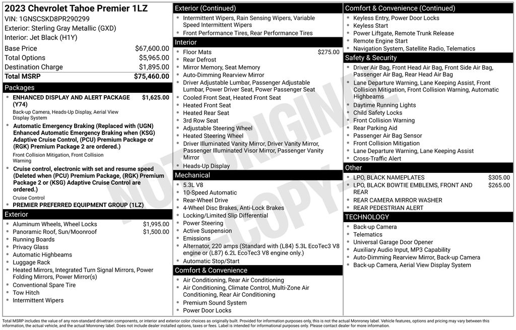 2023 Chevrolet Tahoe Premier Sterling Gray Metallic Premier RWD 10-Speed Automatic with Overdrive EcoTec3 5.3L V8 Jet Black Leather, 10 Speakers, 15" Diagonal Multi-Color Head-Up Display, 1st & 2nd Row Color-Keyed Carpeted Floor Mats, 1st & 2nd Rows Premium Floor Liners (LPO), 20" x 9" Polished Aluminum Wheels, 3.23 Rear Axle Ratio, 3rd Row 60/40 Power-Folding Split-Bench Seat, 3rd row seats: split-bench, 4-Wheel Disc Brakes, ABS brakes, Adaptive suspension, Air Conditioning, Alloy wheels, AM/FM radio: SiriusXM with 360L, Apple CarPlay/Android Auto, Auto High-beam Headlights, Auto-dimming door mirrors, Auto-Dimming Inside Rear-View Mirror, Auto-dimming Rear-View mirror, Auto-leveling suspension, Automatic temperature control, Black Name Plates (LPO), Bose 10-Speaker Centerpoint Surround Audio Sys Ft, Brake assist, Bright Front & Rear Door Sill Plates, Bumpers: body-color, Chrome Door Handles w/Body-Color Strip, Chrome Mirror Caps, Color-Keyed Carpeting Floor Covering, Compass, Delay-off headlights, Driver & Front Outboard Passenger Airbags, Driver door bin, Driver vanity mirror, Dual Exhaust System, Dual front impact airbags, Dual front side impact airbags, Dual-Pane Power Panoramic Sunroof, Electronic Stability Control, Emergency communication system: OnStar and Chevrolet connected services capable, Enhanced Display & Alert Package, Enhanced Driver Information Center, Floor Console, Four wheel independent suspension, Front & Rear Black Bowtie Emblems (LPO), Front anti-roll bar, Front Bucket Seats, Front Center Armrest, Front dual zone A/C, Front High-Back Reclining Bucket Seats, Front reading lights, Fully automatic headlights, Garage door transmitter, Hands-Free Rear Power Programmable Liftgate, HD Surround Vision, Heated & Ventilated Driver & Front Passenger Seats, Heated 2nd Row Outboard Seats, Heated door mirrors, Heated Driver & Front Passenger Seats, Heated front seats, Heated rear seats, Heated Steering Wheel, Heated steering wheel, Illuminated entry, Infotainment Display, Inside Rearview Auto-Dimming Rear Camera Mirror, Lane Change Alert w/Side Blind Zone Alert, LED Daytime Running Lamps, Low tire pressure warning, Magnetic Ride Control Suspension, Memory seat, Memory Settings, Navigation System, Occupant sensing airbag, Outside Heated Power-Adjustable Mirrors, Outside temperature display, Overhead airbag, Overhead console, Panic alarm, Passenger door bin, Passenger vanity mirror, Perforated Leather Seat Trim, Power door mirrors, Power driver seat, Power Liftgate, Power passenger seat, Power Release 2nd Row Bucket Seats, Power steering, Power Tilt & Telescopic Steering Column, Power windows, Preferred Equipment Group 1LZ, Premium audio system: Chevrolet Infotainment 3 Premium, Radio: Chevrolet Infotainment 3 Premium System, Rain sensing wipers, Rear air conditioning, Rear anti-roll bar, Rear Camera Mirror Washer, Rear Cross Traffic Alert, Rear Pedestrian Alert, Rear reading lights, Rear window defroster, Rear window wiper, Remote keyless entry, Remote Start, Roof rack: rails only, Safety Alert Seat, Security system, Set of 4 Wheel Locks (LPO), SiriusXM Radio w/360L, Speed control, Speed-sensing steering, Split folding rear seat, Spoiler, Steering wheel memory, Steering wheel mounted audio controls, Tachometer, Telescoping steering wheel, Tilt steering wheel, Traction control, Trip computer, Turn signal indicator mirrors, Universal Home Remote, Variably intermittent wipers, Ventilated front seats, Voltmeter, Wheels: 22" x 9" 6-Spoke Carbon Flash Metallic Alum, Wireless Charging, Wrapped Steering Wheel, Jet Black Leather.