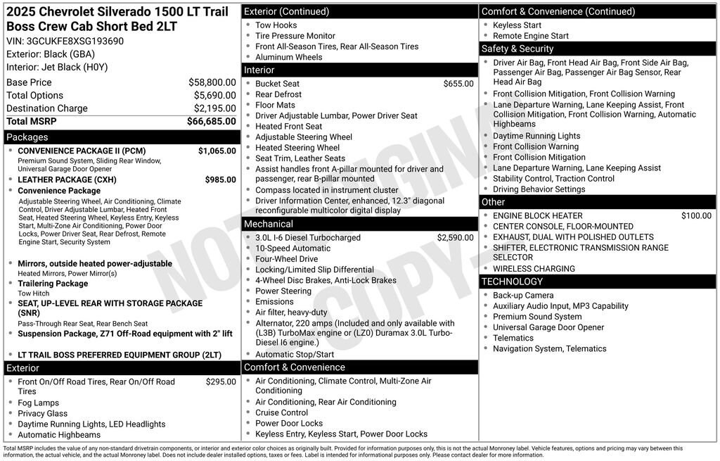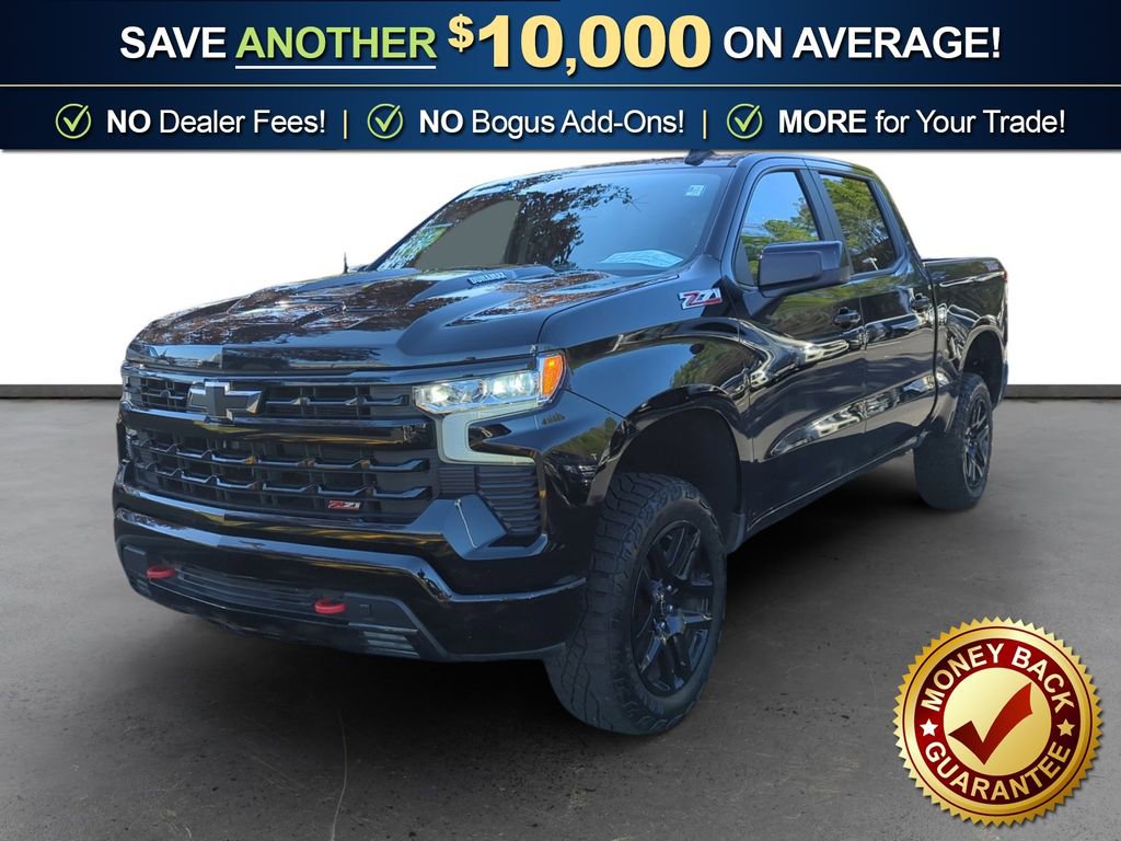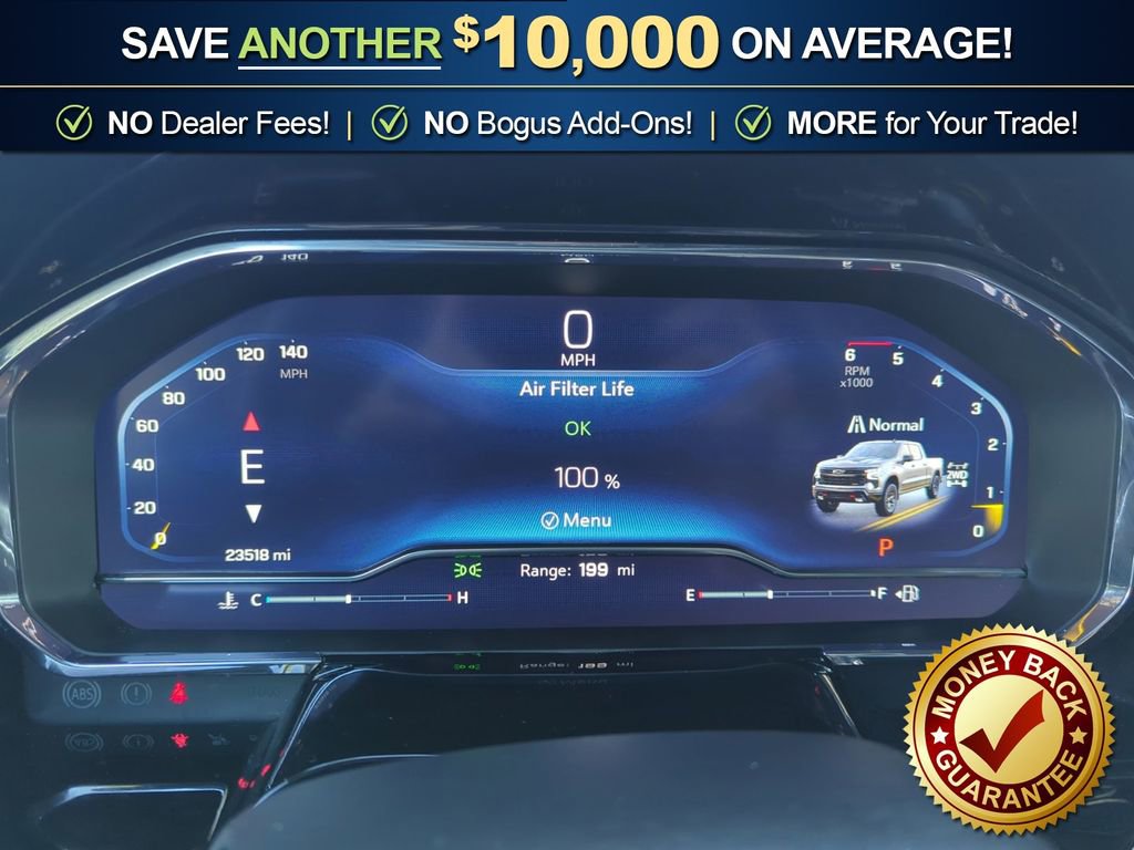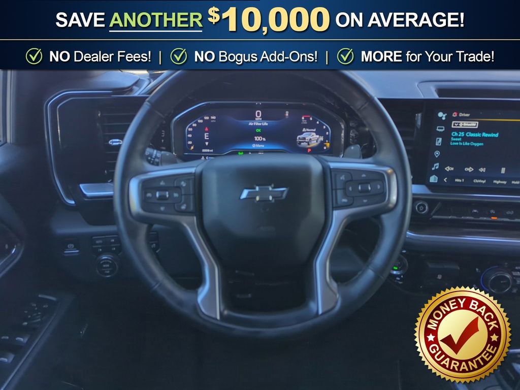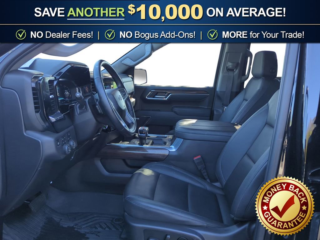 8-Speed Automatic, 4WD, Black Leather, 10-Way Power Driver Seat w/Lumbar, 12.3 Multicolor Reconfigurable Digital Display, 120-Volt Bed Mounted Power Outlet, 120-Volt Interior Power Outlet, 2 USB Data Ports, 220 Amp Alternator, 4-Wheel Disc Brakes, 40/20/40 Front Split-Bench Seat, 6 Speakers, 6-Speaker Audio System, ABS brakes, Air Conditioning, All-Weather Floor Liner (LPO) (AAK), Alloy wheels, AM/FM radio: SiriusXM with 360L, Apple CarPlay/Android Auto, Auto High-beam Headlights, Auto-Locking Rear Differential, Automatic Emergency Braking, Automatic temperature control, Bluetooth® For Phone, Brake assist, Cloth Seat Trim, Color-Keyed Carpeting Floor Covering, Compass, Convenience Package, Convenience Package II, Deep-Tinted Glass, Delay-off headlights, Driver door bin, Driver vanity mirror, Dual Exhaust w/Black Exhaust Tips, Dual Exhaust w/Polished Outlets, Dual front impact airbags, Dual front side impact airbags, Dual Rear USB Ports (Charge Only), Dual-Zone Automatic Climate Control, Electric Rear-Window Defogger, Electronic Cruise Control, Electronic Stability Control, Electronic Transmission Range Selector Shifter, Emergency communication system: OnStar, Engine Block Heater, EZ Lift Power Lock & Release Tailgate, Floor Mounted Center Console, Following Distance Indicator, Forward Collision Alert, Front anti-roll bar, Front Bucket Seats, Front Center Armrest w/Storage, Front dual zone A/C, Front fog lights, Front LED Fog Lamps, Front Pedestrian Braking, Front reading lights, Front wheel independent suspension, Fully automatic headlights, HD Rear Vision Camera, Heated door mirrors, Heated Driver & Front Outboard Passenger Seats, Heated front seats, Heated Power-Adjustable Outside Mirrors, Heated Steering Wheel, Heated steering wheel, Heavy-Duty Air Filter, High Gloss Black Mirror Caps, Hill Descent Control, Hitch Guidance, Hitch Guidance w/Hitch View, Illuminated entry, In-Vehicle Trailering System App, Inside Rear-View Mirror w/Tilt, Integrated Trailer Brake Controller, IntelliBeam Automatic High Beam On/Off, Keyless Open & Start, Lane Keep Assist w/Lane Departure Warning, Leather Package, LED Cargo Area Lighting, Low tire pressure warning, Manual Tilt/Telescoping Steering Column, Occupant sensing airbag, OnStar Services Capable, Outside temperature display, Overhead airbag, Overhead console, Panic alarm, Passenger door bin, Passenger vanity mirror, Performance Red Recovery Hooks, Power door mirrors, Power driver seat, Power Front Windows w/Driver Express Up/Down, Power Front Windows w/Passenger Express Down, Power Rear Windows w/Express Down, Power Sliding Rear Window w/Rear Defogger, Power steering, Power windows, Preferred Equipment Group 2LT, Premium audio system: Chevrolet Infotainment 3 Premium, Premium Bose 7-Speaker Sound System, Radio data system, Radio: Chevrolet Infotainment 3 Premium System, Rear 60/40 Folding Bench Seat (Folds Up), Rear reading lights, Rear step bumper, Rear window defroster, Remote keyless entry, Remote Vehicle Starter System, Security system, Single Outlet Exhaust, SiriusXM w/360L Trial Subscription, Speed control, Speed-sensing steering, Split folding rear seat, Standard Tailgate, Steering Wheel Audio Controls, Steering wheel mounted audio controls, Suspension Package, Tachometer, Teen Driver, Telescoping steering wheel, Theft Deterrent System (Unauthorized Entry), Tilt steering wheel, Tire Pressure Monitoring System, Traction control, Trailering Package, Trip computer, Universal Home Remote, Up-Level Rear Seat w/Storage Package, Variably intermittent wipers, Voltmeter, Wheels: 20 x 9 High Gloss Black Painted Alum, Wi-Fi Hot Spot Capable, Wireless Charging, Wrapped Steering Wheel, 8-Speed Automatic, 4WD, Black Leather.