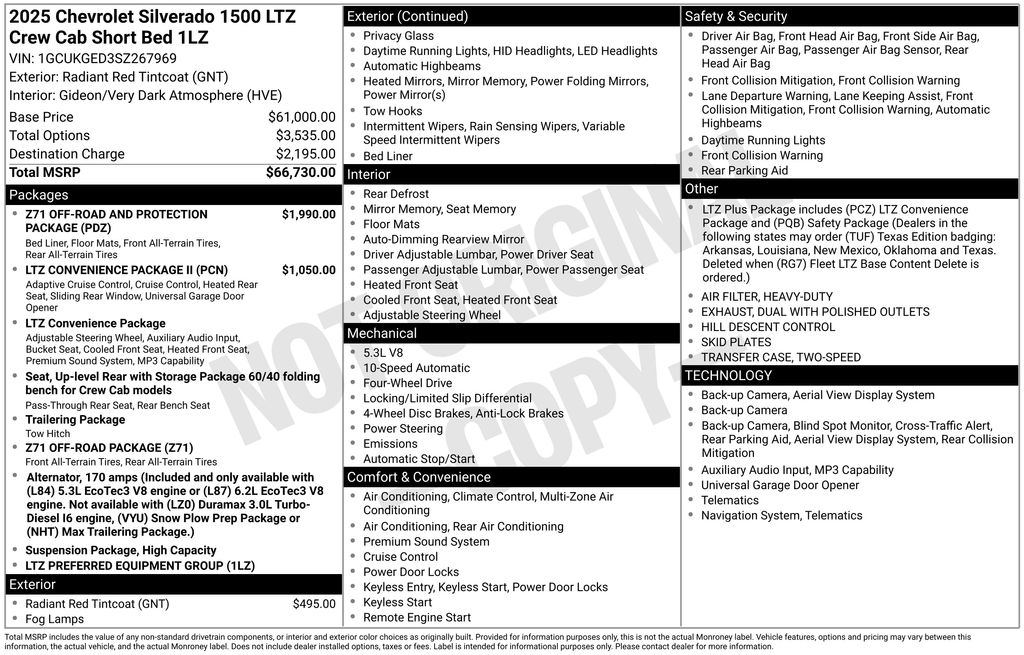 Recent Arrival! 10-Speed Automatic, 4WD, Gideon/Very Dark Atmosphere Leather, 10-Way Power Driver Seat w/Lumbar, 10-Way Power Passenger Seat Adjuster w/Lumbar, 12.3" Multicolor Reconfigurable Digital Display, 120-Volt Bed Mounted Power Outlet, 120-Volt Interior Power Outlet, 170 Amp Alternator, 2 USB Data Ports, 2nd Row Heated Outboard Seats, 3.23 Rear Axle Ratio, 4-Wheel Disc Brakes, 7 Speakers, ABS brakes, Adaptive Cruise Control, Air Conditioning, All-Weather Floor Liner (LPO) (AAK), Alloy wheels, AM/FM radio: SiriusXM with 360L, Apple CarPlay/Android Auto, Auto High-beam Headlights, Auto-dimming door mirrors, Auto-Dimming Inside Rear-View Mirror, Auto-dimming Rear-View mirror, Auto-Locking Rear Differential, Automatic Emergency Braking, Automatic temperature control, Bluetooth® For Phone, Brake assist, Bumpers: chrome, Chevytec Spray-On Black Bedliner, Chrome Mirror Caps, Color-Keyed Carpeting Floor Covering, Compass, Deep-Tinted Glass, Delay-off headlights, Driver door bin, Driver Memory, Driver vanity mirror, Dual Exhaust w/Polished Outlets, Dual front impact airbags, Dual front side impact airbags, Dual Rear USB Ports (Charge Only), Electric Rear-Window Defogger, Electronic Cruise Control, Electronic Stability Control, Electronic Transmission Range Selector Shifter, Emergency communication system: OnStar, Floor Mounted Center Console, Following Distance Indicator, Forward Collision Alert, Front anti-roll bar, Front Bucket Seats, Front Center Armrest, Front dual zone A/C, Front fog lights, Front Frame-Mounted Black Recovery Hooks, Front LED Fog Lamps, Front Pedestrian Braking, Front Rain-Sensing Wipers, Front reading lights, Front Rubberized Vinyl Floor Mats, Front wheel independent suspension, Fully automatic headlights, HD Surround Vision, Heated door mirrors, Heated Driver & Front Outboard Passenger Seats, Heated front seats, Heated Steering Wheel, Heated steering wheel, Heavy-Duty Air Filter, High Capacity Suspension Package, Hill Descent Control, Hitch Guidance, Hitch Guidance w/Hitch View, Illuminated entry, In-Vehicle Trailering System App, Integrated Trailer Brake Controller, IntelliBeam Automatic High Beam On/Off, Keyless Open & Start, Lane Keep Assist w/Lane Departure Warning, LED Cargo Area Lighting, Low tire pressure warning, LTZ Convenience Package, LTZ Convenience Package II, LTZ Plus Package, Memory seat, Occupant sensing airbag, Off-Road Suspension, OnStar Services Capable, Outside Heated Power-Adjustable Mirrors, Outside temperature display, Overhead airbag, Overhead console, Panic alarm, Passenger door bin, Passenger vanity mirror, Perforated Leather-Appointed Front Seat Trim, Perimeter Lighting, Power door mirrors, Power driver seat, Power Front Passenger Windows w/Express Up/Down, Power Front Windows w/Driver Express Up/Down, Power passenger seat, Power Rear Windows w/Express Down, Power Sliding Rear Window w/Rear Defogger, Power steering, Power Tailgate, Power Tilt & Telescoping Steering Column, Power windows, Preferred Equipment Group 1LZ, Premium audio system: Chevrolet Infotainment 3 Premium, Premium Bose 7-Speaker Sound System, Radio data system, Radio: Chevrolet Infotainment 3 Premium System, Rain sensing wipers, Rear Cross Traffic Braking, Rear Pedestrian Alert, Rear reading lights, Rear Rubberized-Vinyl Floor Mats, Rear seat center armrest, Rear step bumper, Rear Wheelhouse Liners, Rear window defroster, Remote keyless entry, Remote Vehicle Starter System, Safety Alert Seat, Safety Package, Security system, SiriusXM w/360L Trial Subscription, Speed control, Speed-sensing steering, Split folding rear seat, Standard Tailgate, Steering Wheel Audio Controls, Steering wheel mounted audio controls, Tachometer, Teen Driver, Telescoping steering wheel, Theft Deterrent System (Unauthorized Entry), Tilt steering wheel, Tire Pressure Monitoring System, Traction control, Trailer Camera Provisions, Trailer Side Blind Zone Alert, Trailering Package, Trip computer, Ultrasonic Front & Rear Park Assist, Unive