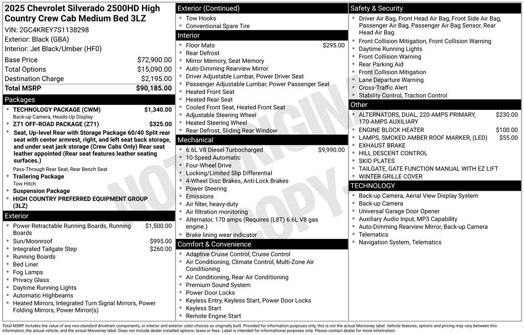 2025 Chevrolet Silverado 2500HD High Country Black High Country 4WD 10-Speed Automatic Duramax 6.6L V8 Turbodiesel 10-Speed Automatic, 4WD, Jet Black/Umber Leather, 10-Way Power Driver Seat Adjuster with Lumbar, 10-Way Power Passenger Seat Adjuster with Lumbar, 120-Volt Bed Mounted Power Outlet, 120-Volt Interior Power Outlet, 15" Diagonal Multicolor Head-Up Display, 170 Amp Alternator, 1st and 2nd Row All-Weather Floor Liners, 4-Wheel Disc Brakes, 6" Rectangular Chromed Tubular Assist Steps, 7 Speakers, 720 Cold-Cranking Amps Heavy-Duty Battery, ABS brakes, Air Conditioning, Alloy wheels, AM/FM radio: SiriusXM with 360L, Apple CarPlay/Android Auto, Auto High-beam Headlights, Auto-dimming door mirrors, Auto-Dimming Inside Rear-View Mirror, Auto-dimming Rear-View mirror, Automatic temperature control, Bed View Camera with Two Trailer Camera Provisions, Black Chevytec Spray-on Bedliner, Bluetooth® For Phone, Bodyside moldings, BOSE Premium 7-Speaker Sound System, Brake assist, Bumpers: body-color, Chevrolet Connected Access Capable, Chrome Door Handles, Chrome Mirror Caps, Color-Keyed Carpeting Floor Covering, Compass, Deep-Tinted Glass, Delay-off headlights, Driver door bin, Driver Memory, Driver vanity mirror, Dual 220-Amp Primary/170-Amp Auxiliary Alternators, Dual front impact airbags, Dual front side impact airbags, Durabed Pickup Bed, Electric Rear-Window Defogger, Electronic Stability Control, Emergency communication system: OnStar, Engine Block Heater, Exhaust Brake, EZ Lift Power Lock and Release Tailgate, Floor-Mounted Center Console, Front anti-roll bar, Front Bucket Seats, Front Carpeted Floor Mats, Front Center Armrest, Front Chrome Recovery Hooks, Front dual zone A/C, Front fog lights, Front LED Fog Lamps, Front Rain-Sensing Wipers, Front reading lights, Front wheel independent suspension, Fully automatic headlights, Garage door transmitter, Genuine wood console insert, Genuine wood dashboard insert, Genuine wood door panel insert, Heated 2nd Row Outboard Seats, Heated door mirrors, Heated Driver and Front Outboard Passenger Seating, Heated front seats, Heated rear seats, Heated Steering Wheel, Heated steering wheel, Hill Descent Control, Hitch Guidance with Hitch View, Illuminated entry, in-Vehicle Trailering App System, Keyless Open and Start, LED Cargo Area Lighting, LED Smoked Amber Roof Marker Lamps, Low tire pressure warning, Manual Tilt and Telescoping Steering Column, Memory seat, Multi-Flex Tailgate, Occupant sensing airbag, Off-Road Suspension, OnStar Services Capable, Outside temperature display, Overhead airbag, Overhead console, Panic alarm, Passenger door bin, Passenger vanity mirror, Perforated Leather Seat Trim, Polished Exhaust Tip, Power Door Locks, Power door mirrors, Power driver seat, Power Front Windows with Driver Express Up/Down, Power Front Windows with Passenger Express Up/Down, Power passenger seat, Power Rear Windows with Express Down, Power Sliding Rear Window with Defogger, Power steering, Power Sunroof, Power Up/Down Tailgate Function with Power Lock and Release, Power windows, Power-Retractable Assist Steps, Preferred Equipment Group 3LZ, Premium audio system: Chevrolet Infotainment 3 Premium, Push Button Start, Radio: Chevrolet Infotainment 3 Premium System, Rain sensing wipers, Rear Camera Mirror, Rear Carpeted Floor Mats, Rear Cross Traffic Alert, Rear reading lights, Rear seat center armrest, Rear step bumper, Rear Wheelhouse Liners, Rear window defroster, Remote keyless entry, Remote Vehicle Starter System, Security system, SiriusXM with 360L Trial Subscription, Speed control, Speed-sensing steering, Split folding rear seat, Standard Tailgate, Steering Wheel Audio Controls, Steering wheel mounted audio controls, Suspension Package, Tachometer, Technology Package, Telescoping steering wheel, Tilt steering wheel, Traction control, Trailer Camera Provisions, Trip computer, Turn signal indicator mirrors, Ultrasonic Front and Rear Park Assist, Unauthorized Entry Theft-Deterrent Syst