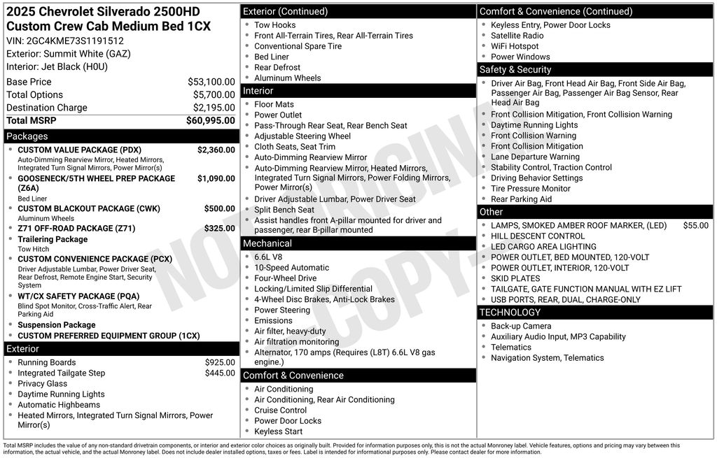 2025 Chevrolet 2500 HD Crew Cab 6.6L Duramax Diesel 4WD with the Allison Transmission is part of Chevrolet's heavy-duty pickup truck lineup. Its built for tough towing, hauling, and off-road capabilities, making it a favorite choice for people needing a strong workhorse for tough jobs or who want serious towing capacity.Expect impressive towing capabilitiesup to 36,000 lbs when properly equipped with a fifth-wheel or gooseneck hitch.