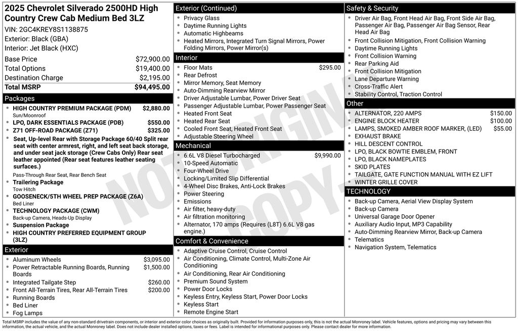 2025 Chevrolet Silverado 2500HD High Country Black High Country 4WD 10-Speed Automatic Duramax 6.6L V8 Turbodiesel 10-Speed Automatic, 4WD, Jet Black Leather, 10-Way Power Driver Seat Adjuster with Lumbar, 10-Way Power Passenger Seat Adjuster with Lumbar, 120-Volt Bed Mounted Power Outlet, 120-Volt Interior Power Outlet, 15" Diagonal Multicolor Head-Up Display, 170 Amp Alternator, 1st and 2nd Row All-Weather Floor Liners, 22" Gloss Black Aluminum Wheels, 220 Amp Alternator, 4-Wheel Disc Brakes, 6" Rectangular Chromed Tubular Assist Steps, 7 Speakers, 720 Cold-Cranking Amps Heavy-Duty Battery, ABS brakes, Air Conditioning, Alloy wheels, AM/FM radio: SiriusXM with 360L, Apple CarPlay/Android Auto, Auto High-beam Headlights, Auto-dimming door mirrors, Auto-Dimming Inside Rear-View Mirror, Auto-dimming Rear-View mirror, Automatic temperature control, Bed View Camera with Two Trailer Camera Provisions, Black Chevytec Spray-on Bedliner, Black Name Plates, Black Tailgate Lettering, Bluetooth® For Phone, Bodyside moldings, BOSE Premium 7-Speaker Sound System, Brake assist, Bumpers: body-color, Chevrolet Connected Access Capable, Chrome Door Handles, Chrome Mirror Caps, Color-Keyed Carpeting Floor Covering, Compass, Dark Essentials Package, Deep-Tinted Glass, Delay-off headlights, Driver door bin, Driver Memory, Driver vanity mirror, Dual front impact airbags, Dual front side impact airbags, Durabed Pickup Bed, Electric Rear-Window Defogger, Electronic Stability Control, Emergency communication system: OnStar, Engine Block Heater, Exhaust Brake, EZ Lift Power Lock and Release Tailgate, Floor-Mounted Center Console, Front anti-roll bar, Front Black Bowtie Emblem, Front Bucket Seats, Front Carpeted Floor Mats, Front Center Armrest, Front Chrome Recovery Hooks, Front dual zone A/C, Front fog lights, Front LED Fog Lamps, Front Rain-Sensing Wipers, Front reading lights, Front wheel independent suspension, Fully automatic headlights, Garage door transmitter, Genuine wood console insert, Genuine wood dashboard insert, Genuine wood door panel insert, Gooseneck/5th Wheel Prep Package, Heated 2nd Row Outboard Seats, Heated door mirrors, Heated Driver and Front Outboard Passenger Seating, Heated front seats, Heated rear seats, Heated Steering Wheel, Heated steering wheel, High Country Premium Package, Hill Descent Control, Hitch Guidance with Hitch View, Illuminated entry, in-Vehicle Trailering App System, Keyless Open and Start, LED Cargo Area Lighting, LED Smoked Amber Roof Marker Lamps, Low tire pressure warning, Manual Tilt and Telescoping Steering Column, Memory seat, Multi-Flex Tailgate, Occupant sensing airbag, Off-Road Suspension, OnStar Services Capable, Outside temperature display, Overhead airbag, Overhead console, Panic alarm, Passenger door bin, Passenger vanity mirror, Perforated Leather Seat Trim, Polished Exhaust Tip, Power Door Locks, Power door mirrors, Power driver seat, Power Front Windows with Driver Express Up/Down, Power Front Windows with Passenger Express Up/Down, Power passenger seat, Power Rear Windows with Express Down, Power Sliding Rear Window with Defogger, Power steering, Power Sunroof, Power Up/Down Tailgate Function with Power Lock and Release, Power windows, Power-Retractable Assist Steps, Preferred Equipment Group 3LZ, Premium audio system: Chevrolet Infotainment 3 Premium, Push Button Start, Radio: Chevrolet Infotainment 3 Premium System, Rain sensing wipers, Rear Camera Mirror, Rear Carpeted Floor Mats, Rear Cross Traffic Alert, Rear reading lights, Rear seat center armrest, Rear step bumper, Rear Wheelhouse Liners, Rear window defroster, Remote keyless entry, Remote Vehicle Starter System, Security system, SiriusXM with 360L Trial Subscription, Speed control, Speed-sensing steering, Split folding rear seat, Standard Tailgate, Steering Wheel Audio Controls, Steering wheel mounted audio controls, Suspension Package, Tachometer, Technology Package, Telescoping steering wheel, Tilt steering wheel, Traction cont