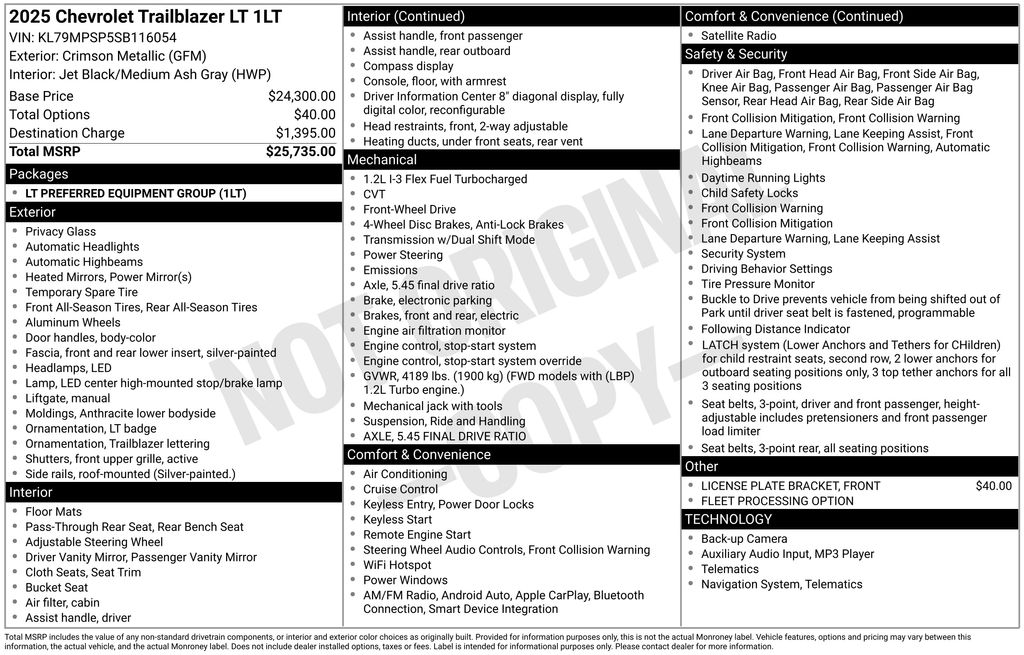 2025 Chevrolet TrailBlazer LT Crimson Metallic LT FWD CVT 1.2L I3 DI Flex Fuel Turbocharged DOHC 12V LEV3-SULEV30 137hp 1 Type-A and 1 Type-C USB Ports, 4-Way Manual Front Passenger Seat Adjuster, 4-Wheel Disc Brakes, 5.45 Final Drive Axle Ratio, 6 Speakers, 6-Speaker Audio System Feature, 6-Way Manual Driver Seat Adjuster, ABS brakes, Air Conditioning, Alloy wheels, AM/FM radio: SiriusXM, Auto High-beam Headlights, Brake assist, Bumpers: body-color, Cloth Seat Trim, Compass, Delay-off headlights, Driver door bin, Driver vanity mirror, Dual front impact airbags, Dual front side impact airbags, Electronic Stability Control, Emergency communication system: OnStar and Chevrolet connected services capable, Exterior Parking Camera Rear, Flat-Folding Front Passenger Seatback, Front anti-roll bar, Front Bucket Seats, Front Center Armrest, Front License Plate Bracket, Front reading lights, Front wheel independent suspension, Fully automatic headlights, Heated door mirrors, Illuminated entry, Knee airbag, Low tire pressure warning, Occupant sensing airbag, Overhead airbag, Overhead console, Panic alarm, Passenger door bin, Passenger vanity mirror, Power door mirrors, Power steering, Power windows, Preferred Equipment Group 1LT, Radio data system, Radio: AM/FM Stereo Audio System, Rear side impact airbag, Rear window defroster, Rear window wiper, Remote keyless entry, Ride and Handling Suspension, Security system, SiriusXM Trial Subscription, Speed control, Split folding rear seat, Spoiler, Steering wheel mounted audio controls, Tachometer, Telescoping steering wheel, Tilt steering wheel, Traction control, Trip computer, Variably intermittent wipers, Wheels: 17" High Gloss Black Machined Aluminum, Wireless Apple CarPlay/Android Auto.