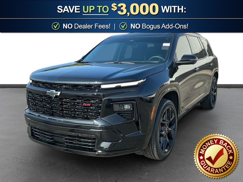 2026 Chevrolet Traverse RS Mosaic Black Metallic RS FWD 8-Speed Automatic 2.5L DOHC 12 Speakers, 3rd row seats: split-bench, 4-Wheel Disc Brakes, 6-Way Power Front Passenger Seat Adjuster, 8-Way Power Driver Seat Adjuster, ABS brakes, Air Conditioning, Alloy wheels, AM/FM radio: SiriusXM with 360L, Apple CarPlay/Android Auto, Auto High-beam Headlights, Auto tilt-away steering wheel, Auto-dimming door mirrors, Automatic temperature control, Bose Premium 12-Speaker Audio System Feature, Brake assist, Bumpers: body-color, Child-Seat-Sensing Airbag, Compass, Delay-off headlights, Driver 4-Way Power Lumbar Seat Adjuster, Driver door bin, Driver vanity mirror, Dual front impact airbags, Dual front side impact airbags, Electronic Stability Control, Emergency communication system: OnStar, Exterior Parking Camera Rear, Four wheel independent suspension, Front anti-roll bar, Front Bucket Seats, Front Center Armrest, Front dual zone A/C, Front Passenger 4-Way Power Lumbar Seat Adjuster, Front reading lights, Fully automatic headlights, Garage door transmitter, Heated door mirrors, Heated Driver and Front Passenger Seats, Heated front seats, Heated rear seats, Heated steering wheel, Illuminated entry, Low tire pressure warning, Memory seat, Navigation System, Occupant sensing airbag, Outside temperature display, Overhead airbag, Overhead console, Panic alarm, Passenger door bin, Passenger vanity mirror, Perforated Leather-Appointed Seat Trim, Power door mirrors, Power driver seat, Power Dual Glass Panoramic Sliding Sunroof, Power Liftgate, Power passenger seat, Power steering, Power windows, Preferred Equipment Group 1RS, Radio data system, Radio: : Audio System w/17.7" Diagonal Display, Rain sensing wipers, Rear air conditioning, Rear anti-roll bar, Rear reading lights, Rear window defroster, Rear window wiper, Remote keyless entry, Security system, SiriusXM with 360L Trial Subscription, Speed control, Speed-sensing steering, Split folding rear seat, Spoiler, Sport steering wheel, Steering wheel memory, Steering wheel mounted audio controls, Tachometer, Telescoping steering wheel, Tilt steering wheel, Traction control, Trip computer, Turn signal indicator mirrors, Variably intermittent wipers, Ventilated Driver and Front Passenger Seats, Ventilated front seats, Voltmeter, Wheels: 22" High Gloss Black Painted Aluminum.