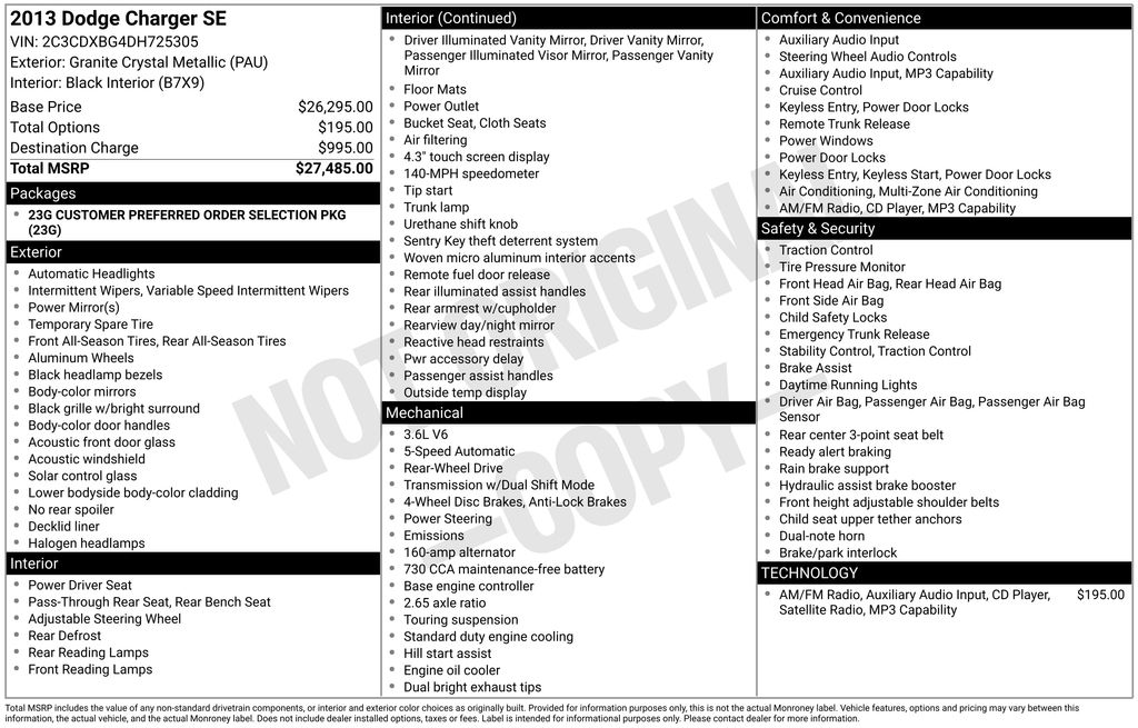 2013 Dodge Charger SE RWD 5-Speed Automatic 3.6L 6-Cylinder SMPI DOHC Granite Crystal Metallic Clearcoat