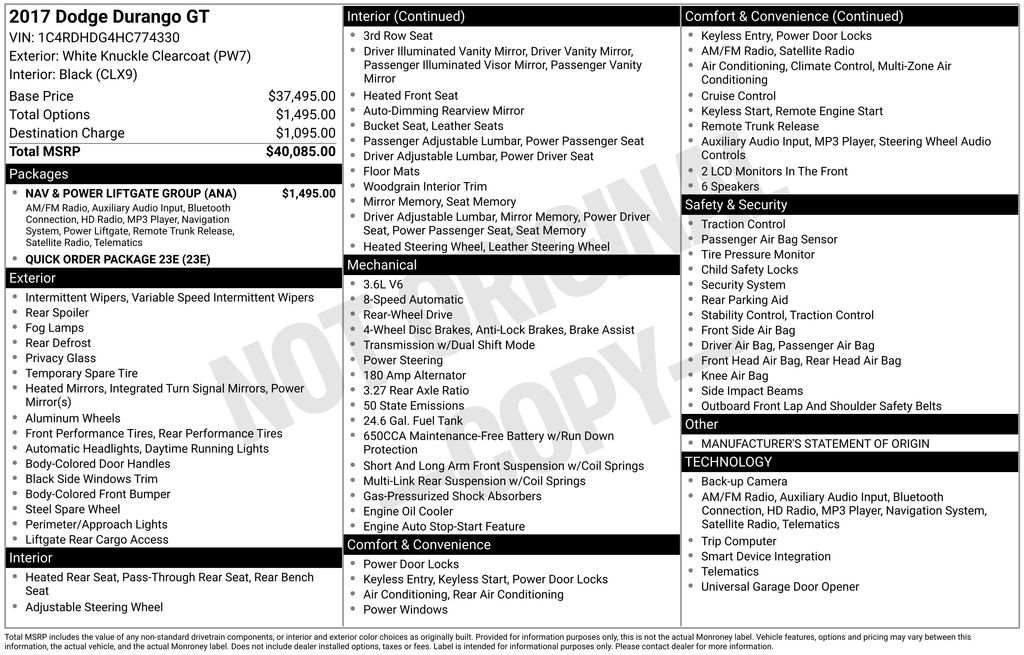 2017 Dodge Durango GT White Knuckle Clearcoat GT RWD 8-Speed Automatic 3.6L V6 24V VVT 3.27 Rear Axle Ratio, 3rd row seats: split-bench, 4-Wheel Disc Brakes, 5-Year SiriusXM Traffic Service, 5-Year SiriusXM Travel Link Service, 6 Speakers, 8.4" Touchscreen Display, ABS brakes, Air Conditioning, Alloy wheels, AM/FM radio: SiriusXM, Anti-whiplash front head restraints, Audio memory, Auto-dimming door mirrors, Auto-dimming Rear-View mirror, Auto-leveling suspension, Automatic temperature control, Brake assist, Bumpers: body-color, Compass, Delay-off headlights, Driver door bin, Driver vanity mirror, Dual front impact airbags, Dual front side impact airbags, Electronic Stability Control, Emergency communication system: Uconnect Access, Exterior Parking Camera Rear, Four wheel independent suspension, Front anti-roll bar, Front Bucket Seats, Front Center Armrest w/Storage, Front dual zone A/C, Front fog lights, Front reading lights, Fully automatic headlights, Garage door transmitter, GPS Antenna Input, GPS Navigation, HD Radio, Heated door mirrors, Heated front seats, Heated rear seats, Heated steering wheel, Illuminated entry, Integrated Voice Command w/Bluetooth, Knee airbag, Leather Trimmed Bucket Seats, Low tire pressure warning, Manufacturer's Statement of Origin, Memory seat, Nav & Power Liftgate Group, Nav-Capable! See Dealer for Details, Occupant sensing airbag, Outside temperature display, Overhead airbag, Overhead console, Panic alarm, Passenger door bin, Passenger vanity mirror, Power door mirrors, Power driver seat, Power Liftgate, Power passenger seat, Power steering, Power windows, Quick Order Package 23E, Radio data system, Radio: Uconnect 3C Nav w/8.4" Display, Radio: Uconnect 3C w/8.4" Display, Rear air conditioning, Rear anti-roll bar, Rear reading lights, Rear seat center armrest, Rear window defroster, Rear window wiper, Remote keyless entry, Roadside Assistance & 9-1-1 Call, Security system, SiriusXM Traffic, SiriusXM Travel Link, Speed control, Speed-Sensitive Wipers, Split folding rear seat, Spoiler, Steering wheel mounted audio controls, Tachometer, Telescoping steering wheel, Tilt steering wheel, Traction control, Trip computer, Turn signal indicator mirrors, Variably intermittent wipers, Wheels: 20" x 8.0" Premium Painted Aluminum.