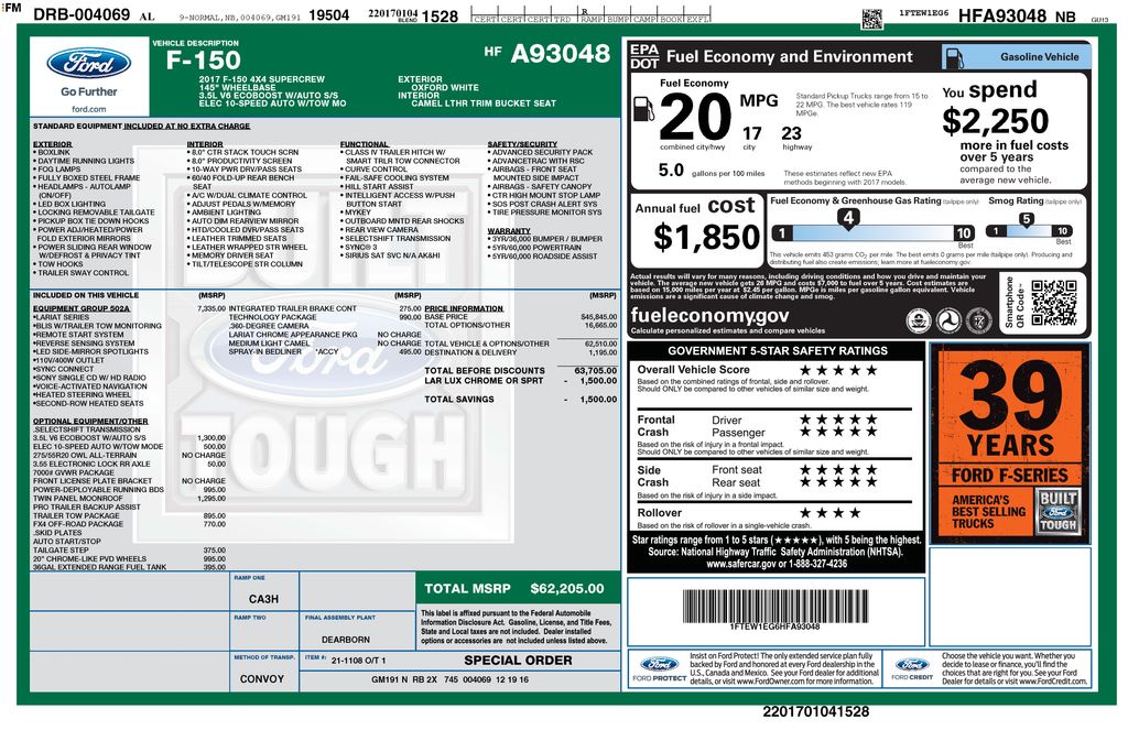 The 2017 Ford F-150 Crew Cab Lariat 4WD is a four-door full-size pickup truck with seating for up to 56 people (depending on configuration). Its known for combining comfort and capability, with a roomy interior, strong towing performance, and a versatile selection of engines.3.5L EcoBoost V6 ~375 hp and 470 lb-ft torque