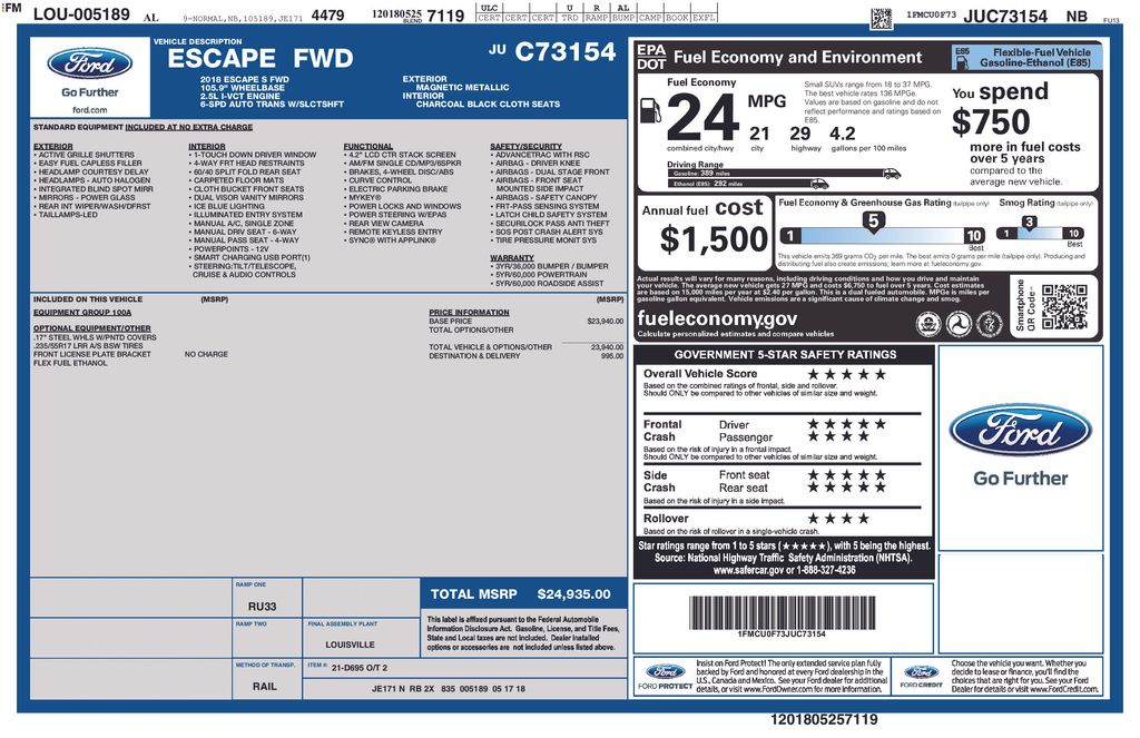 2018 Ford Escape S Magnetic Metallic S FWD 6-Speed Automatic 2.5L i-VCT 3.51 Axle Ratio, 4-Wheel Disc Brakes, 6 Speakers, ABS brakes, Air Conditioning, AM/FM radio, Brake assist, Bumpers: body-color, CD player, Cloth Front Bucket Seats, Compass, Delay-off headlights, Driver door bin, Driver vanity mirror, Dual front impact airbags, Dual front side impact airbags, Electronic Stability Control, Emergency communication system: 911 Assist, Equipment Group 100A, Exterior Parking Camera Rear, Four wheel independent suspension, Front anti-roll bar, Front Bucket Seats, Front Center Armrest, Front License Plate Bracket, Front reading lights, Fully automatic headlights, Illuminated entry, Knee airbag, Low tire pressure warning, Occupant sensing airbag, Outside temperature display, Overhead airbag, Overhead console, Panic alarm, Passenger door bin, Passenger vanity mirror, Power door mirrors, Power steering, Power windows, Radio data system, Radio: AM/FM Stereo w/Single-CD/MP3 Player, Rear anti-roll bar, Rear window defroster, Rear window wiper, Remote keyless entry, Speed control, Speed-sensing steering, Split folding rear seat, Steering wheel mounted audio controls, SYNC Communications & Entertainment System, Tachometer, Telescoping steering wheel, Tilt steering wheel, Traction control, Trip computer, Variably intermittent wipers, Wheels: 17" Steel w/Sparkle Silver-Painted Covers.