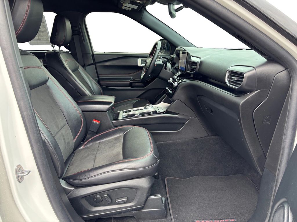 2023 Ford Explorer ST-Line Star White Metallic Tri-Coat ST-Line RWD 10-Speed Automatic 2.3L EcoBoost I-4 12 Speakers, 20" Machined Aluminum w/Painted Pockets Wheels, 3.58 Non-Limited-Slip Rear Axle Ratio, 3rd row seats: bench, 4-Wheel Disc Brakes, 4G LTE Wi-Fi Hotspot Credit, ABS brakes, Air Conditioning, Alloy wheels, AM/FM radio: SiriusXM, Auto High-beam Headlights, Auto Start-Stop Removal (DISC), Auto-dimming Rear-View mirror, Automatic temperature control, Brake assist, Bumpers: body-color, Class IV Trailer Tow Package, Compass, Delay-off headlights, Driver door bin, Driver vanity mirror, Dual front impact airbags, Dual front side impact airbags, Electronic Stability Control, Emergency communication system: SYNC 3 911 Assist, Equipment Group 250A, Exterior Parking Camera Rear, FordPass Connect, Four wheel independent suspension, Front anti-roll bar, Front Bucket Seats, Front Center Armrest, Front dual zone A/C, Front fog lights, Front reading lights, Fully automatic headlights, Heated door mirrors, Heated front seats, Heated steering wheel, Htd ActiveX Trimmed Captain's Chairs w/Miko Insert, Illuminated entry, Knee airbag, Leather steering wheel, Low tire pressure warning, Navigation System, Occupant sensing airbag, Outside temperature display, Overhead airbag, Overhead console, Panic alarm, Passenger door bin, Passenger vanity mirror, Power door mirrors, Power driver seat, Power Liftgate, Power passenger seat, Power steering, Power windows, Radio data system, Radio: B&O Sound System by Bang & Olufsen, Rain sensing wipers, Rear air conditioning, Rear anti-roll bar, Rear reading lights, Rear window defroster, Rear window wiper, Remote keyless entry, Security system, Speed control, Speed-sensing steering, Speed-Sensitive Wipers, Split folding rear seat, Spoiler, Steering wheel mounted audio controls, SYNC 3 Communications & Entertainment System, SYNC 3/Apple CarPlay/Android Auto, Tachometer, Telescoping steering wheel, Tilt steering wheel, Traction control, Trip computer, Variably intermittent wipers, Voice-Activated Touchscreen Navigation System.