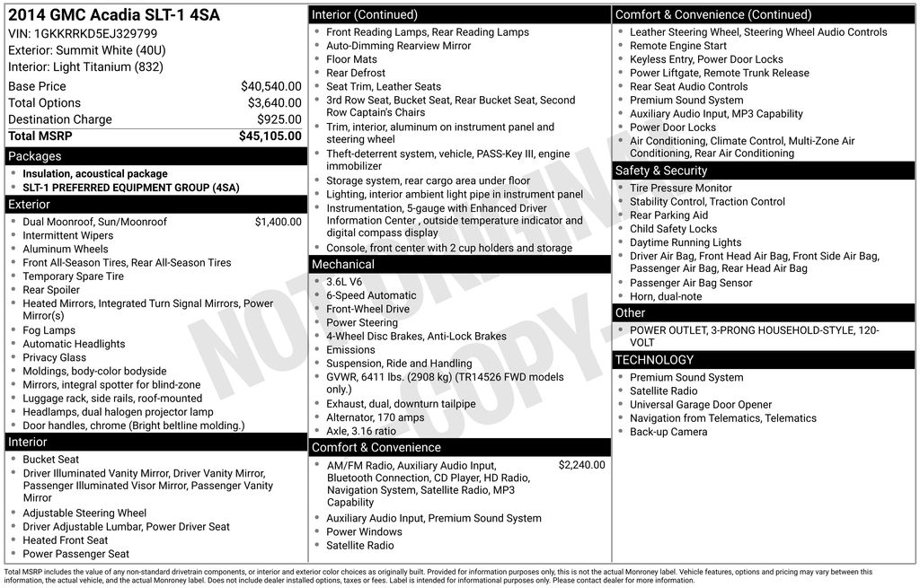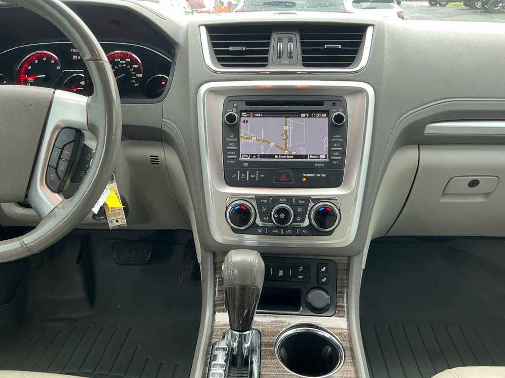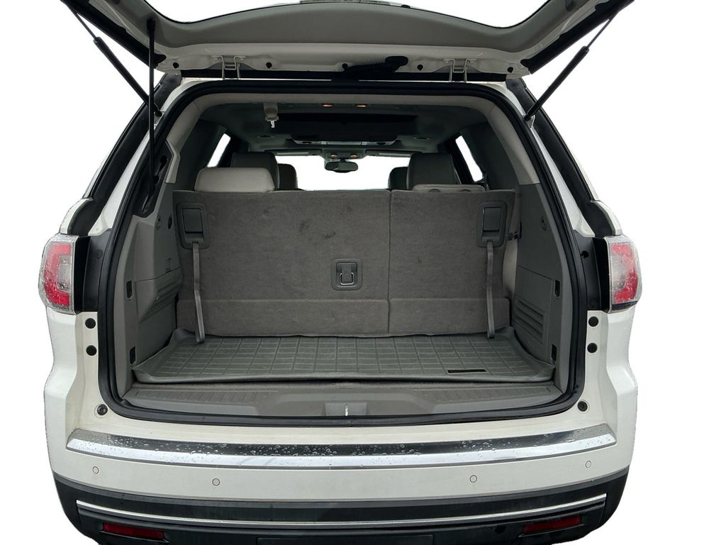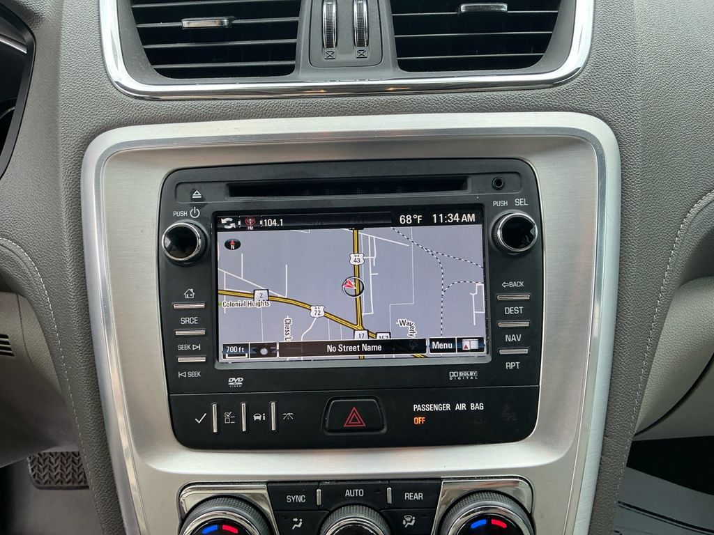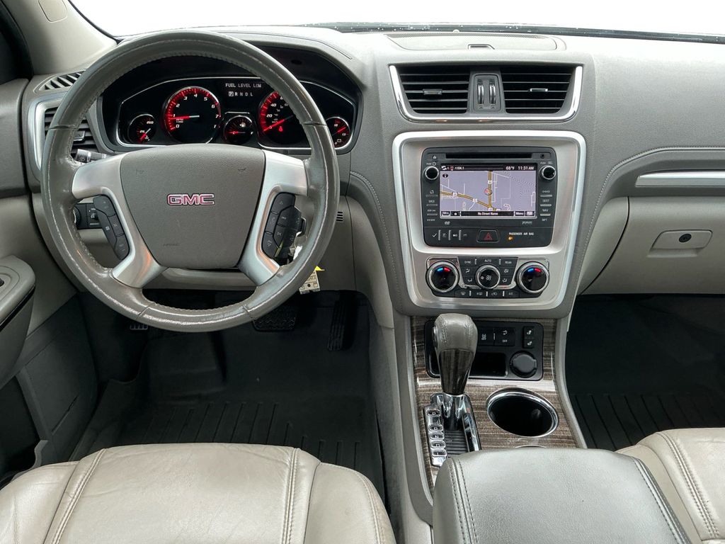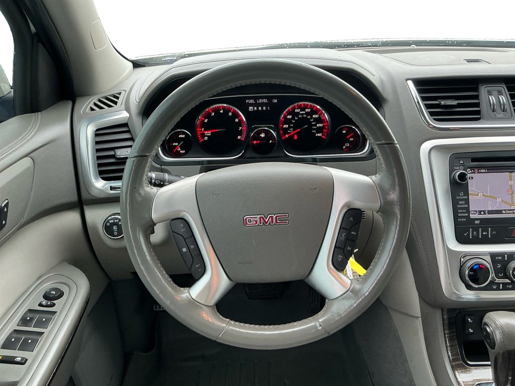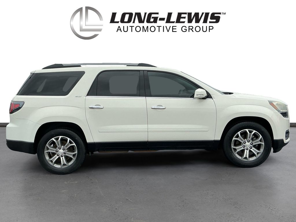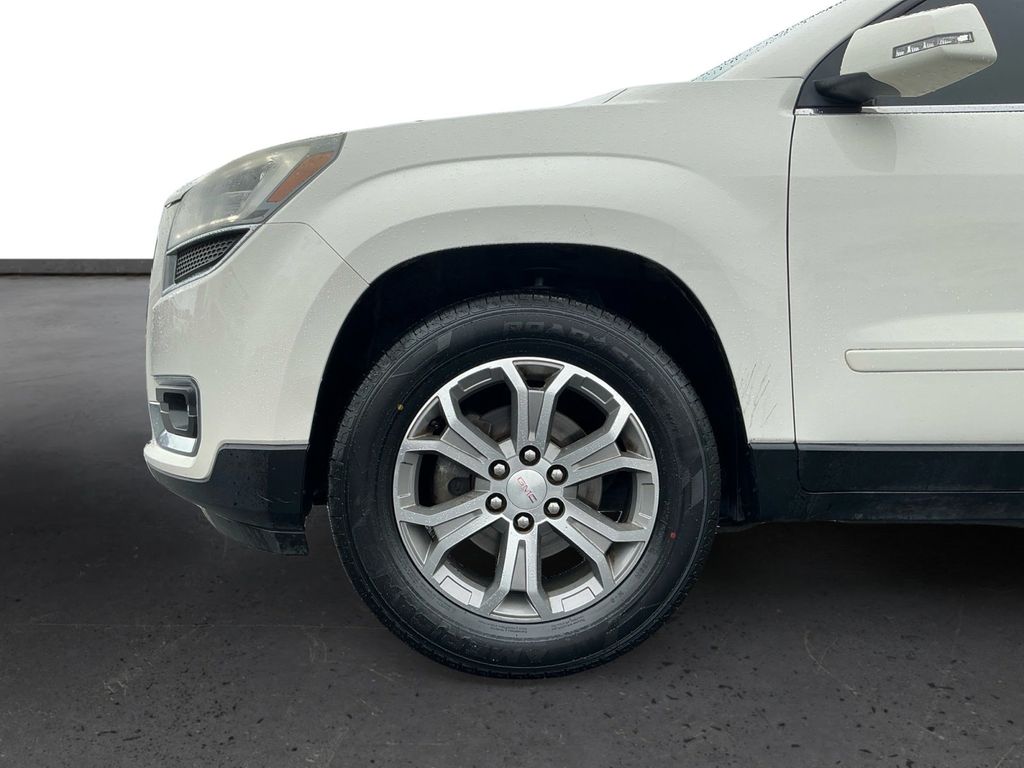 2014 GMC Acadia SLT-1 Summit White SLT-1 FWD 6-Speed Automatic 3.6L V6 SIDI FWD, Light Titanium Leather, 10 Speakers, 120-Volt 3-Prong Household-Style Power Outlet, 19" x 7.5" Aluminum (4) Wheels, 2-Way Power Front Passenger Seat, 3.16 Axle Ratio, 3rd row seats: split-bench, 4-Wheel Disc Brakes, 7-Passenger Seating (2-2-3 Seating Configuration), 8-Way Power Driver Seat, ABS brakes, Acoustical Insulation Package, Air Conditioning, Alloy wheels, AM/FM radio: SiriusXM, Auto-dimming Rear-View mirror, Automatic temperature control, Body-Color Bodyside Moldings, Body-Color Heated Power-Adjustable Outside Mirrors, Bodyside moldings, Bose Advanced 10-Speaker Audio System, Bose Premium 10-Speaker Audio System, Brake assist, Bumpers: body-color, Carpeted Removable Front 2nd & 3rd Row Floor Mats, CD player, Compass, Delay-off headlights, Driver door bin, Driver vanity mirror, Dual Downturn Tailpipe Exhaust, Dual front impact airbags, Dual front side impact airbags, Dual SkyScape 2-Panel Power Sunroof, Electronic Stability Control, Emergency communication system: OnStar Directions & Connections, Exterior Parking Camera Rear, Four wheel independent suspension, Front anti-roll bar, Front Bucket Seats, Front Center Armrest w/Storage, Front dual zone A/C, Front fog lights, Front reading lights, Fully automatic headlights, Garage door transmitter, Heated door mirrors, Heated Driver & Front Passenger Seats, Heated front seats, Illuminated entry, Inside Rear-View Auto-Dimming Mirror, Integral Spotter Blind-Zone Mirrors, Leather Shift Knob, Leather-Appointed Seat Trim, Leather-Wrapped Steering Wheel, Low tire pressure warning, NavTraffic, Occupant sensing airbag, Outside temperature display, Overhead airbag, Overhead console, Panic alarm, Passenger door bin, Passenger vanity mirror, Power door mirrors, Power driver seat, Power Liftgate, Power passenger seat, Power Rear Liftgate Body, Power steering, Power windows, Power Windows w/Driver Express-Down, Preferred Equipment Group 4SA, Radio data system, Radio: Color Touch AM/FM/HD/CD w/IntelliLink, Radio: Color Touch w/Navigation & IntelliLink, Rear air conditioning, Rear anti-roll bar, Rear audio controls, Rear Audio System Controls, Rear reading lights, Rear Seat Entertainment System, Rear window defroster, Rear window wiper, Reclining Bucket Seats, Remote keyless entry, Remote Vehicle Start, Ride & Handling Suspension, Roof rack: rails only, Security system, SiriusXM Satellite Radio, Speed control, Speed-sensing steering, Spoiler, Steering Wheel Mounted Audio Controls, Steering wheel mounted audio controls, Tachometer, Telescoping steering wheel, Tilt & Telescopic Steering Column, Tilt steering wheel, Traction control, Tri-Zone Automatic Climate Control, Trip computer, Turn signal indicator mirrors, Universal Home Remote, Variable Effort Power Steering, Variably intermittent wipers, Voltmeter, FWD, Light Titanium Leather.