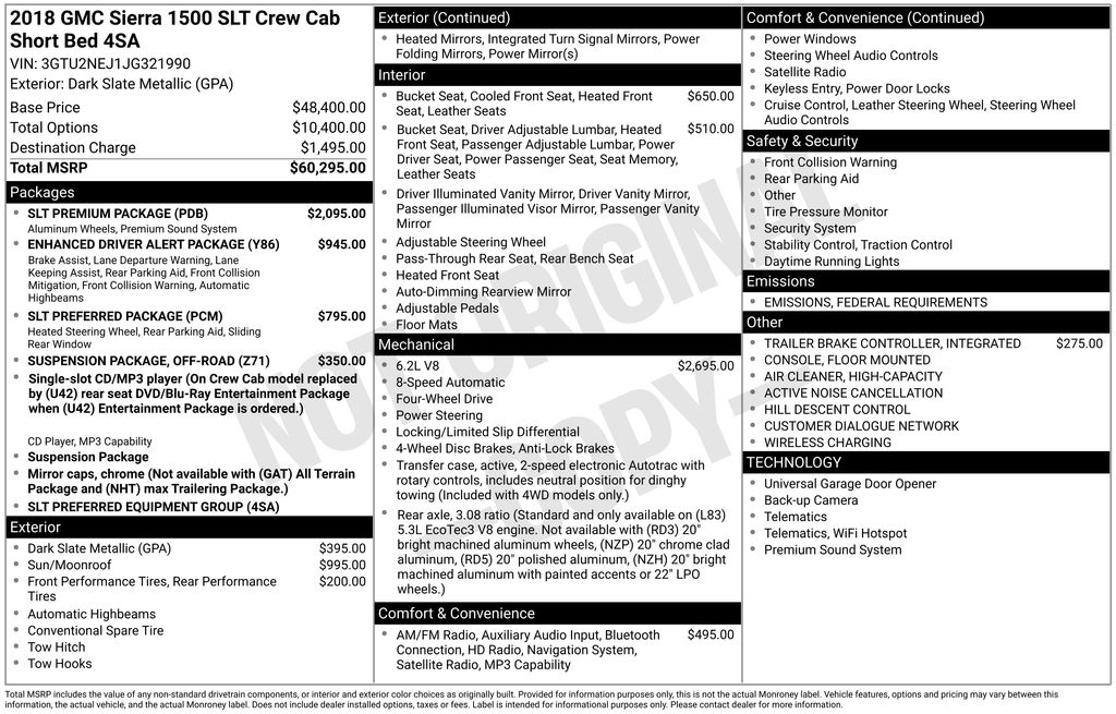 2018 GMC Sierra 1500 SLT Dark Slate Metallic SLT 4WD 8-Speed Automatic with Overdrive EcoTec3 6.2L V8 8-Speed Automatic with Overdrive, 4WD, Jet Black Leather, 10-Way Power Driver's Seat Adjuster, 110-Volt AC Power Outlet, 150 Amp Alternator, 1st & 2nd Row Color-Keyed Carpeted Floor Mats, 2-Speed Active Electronic AutoTrac Transfer Case, 20" x 9" Polished Aluminum Wheels, 4-Wheel Disc Brakes, 4.2" Diagonal Color Display Driver Info Center, 40/20/40 Front Split Bench Seat, 6 Speaker Audio System, 6 Speakers, 6-Speaker Audio System, 6" Rectangular Chromed Tubular Assist Steps, ABS brakes, Active Noise Cancellation, Adjustable pedals, Air Conditioning, Alloy wheels, AM/FM radio: SiriusXM, Auto-dimming door mirrors, Auto-Dimming Inside Rear-View Mirror, Auto-dimming Rear-View mirror, Automatic temperature control, Auxiliary External Transmission Oil Cooler, Bodyside moldings, Bose Speaker System, Brake assist, Bumpers: chrome, CD player, Chrome Bodyside Moldings, Chrome Door Handles, Chrome Mirror Caps, Color-Keyed Carpeting, Compass, Deep-Tinted Glass, Delay-off headlights, Driver & Front Passenger Illuminated Vanity Mirrors, Driver door bin, Driver vanity mirror, Dual front impact airbags, Dual front side impact airbags, Dual-Zone Automatic Climate Control, Electric Rear-Window Defogger, Electronic Stability Control, Enhanced Driver Alert Package, Exterior Parking Camera Rear, EZ Lift & Lower Tailgate, Floor Mounted Console, Forward Collision Alert, Front anti-roll bar, Front Center Armrest w/Storage, Front dual zone A/C, Front fog lights, Front Frame-Mounted Black Recovery Hooks, Front Full Feature Power Reclining Bucket Seats, Front License Plate Kit, Front reading lights, Front wheel independent suspension, Fully automatic headlights, Garage door transmitter, GMC 4G LTE, GMC Connected Access, HD Radio, Heated & Ventilated Front Bucket Seats, Heated door mirrors, Heated Driver & Front Passenger Seats, Heated front seats, Heavy Duty Suspension, Heavy-Duty Rear Locking Differential, High-Intensity Discharge Headlights, Hill Descent Control, Illuminated entry, Integrated Trailer Brake Controller, IntelliBeam Automatic High Beam On/Off Headlight, Lane Keep Assist, Leather Appointed Seat Trim, Leather Wrapped Heated Steering Wheel, Leather Wrapped Steering Wheel w/Cruise Controls, LED Cargo Box Lighting, LED Tailamps w/Signature, Low Speed Forward Automatic Braking, Low tire pressure warning, Manual Tilt/Telescoping Steering Column, Memory seat, Occupant sensing airbag, Off-Road Suspension Package, OnStar & GMC Connected Services Capable, Outside temperature display, Overhead airbag, Overhead console, Panic alarm, Passenger door bin, Passenger vanity mirror, Power Adjustable Pedals, Power door mirrors, Power driver seat, Power Folding & Adjustable Heated Outside Mirrors, Power passenger seat, Power Sliding Rear Window w/Defogger, Power steering, Power Sunroof, Power windows, Power Windows w/Driver Express Up & Down, Preferred Equipment Group 4SA, Premium audio system: GMC Infotainment System, Radio data system, Radio: AM/FM/GMC Infotainment & Navigation, Radio: AM/FM/GMC Infotainment System, Rear 60/40 Folding Bench Seat (Folds Up), Rear reading lights, Rear seat center armrest, Rear step bumper, Rear Wheelhouse Liners, Rear window defroster, Remote Keyless Entry, Remote keyless entry, Remote Vehicle Starter System, Security system, Single Slot CD/MP3 Player, SiriusXM Satellite Radio, SLT Preferred Package, SLT Premium Package, Speed control, Speed-sensing steering, Split folding rear seat, Steering Wheel Audio Controls, Steering wheel mounted audio controls, Tachometer, Telescoping steering wheel, Theft Deterrent System (Unauthorized Entry), Thin Profile LED Fog Lamps, Tilt steering wheel, Traction control, Trailering Equipment, Trip computer, Turn signal indicator mirrors, Ultrasonic Front & Rear Park Assist, Universal Home Remote, Variably intermittent wipers, Voltmeter, Wheels: 18" x 8.5" Polished Aluminum, Wireless Charging, 8
