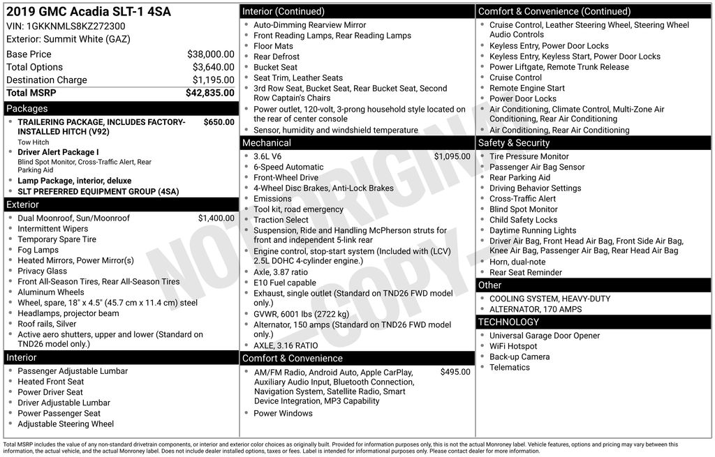 2019 GMC Acadia SLT-1 Summit White SLT-1 FWD 6-Speed Automatic 3.6L V6 SIDI FWD, Cocoa/ Light Ash Gray Leather, 170 Amp Alternator, 18" x 7.5" Aluminum (4) Wheels, 3rd row seats: split-bench, 4-Wheel Disc Brakes, 6-Passenger (2-2-2 Seating Configuration), 8 Speakers, 8-Way Power Front Passenger Seat Adjuster, ABS brakes, Air Conditioning, Alloy wheels, AM/FM radio: SiriusXM, Apple CarPlay/Android Auto, Auto-dimming door mirrors, Auto-dimming Rear-View mirror, Automatic temperature control, Bose Premium 8-Speaker System, Brake assist, Bumpers: body-color, Compass, Delay-off headlights, Driver door bin, Driver vanity mirror, Dual front impact airbags, Dual front side impact airbags, Dual SkyScape 2-Panel Power Sunroof, Electronic Stability Control, Emergency communication system: OnStar and GMC connected services capable, Exterior Parking Camera Rear, Four wheel independent suspension, Front anti-roll bar, Front Bucket Seats, Front Center Armrest, Front dual zone A/C, Front fog lights, Front reading lights, Fully automatic headlights, Garage door transmitter, Heated door mirrors, Heated Driver & Front Passenger Seats, Heated front seats, Heavy-Duty Cooling System, Illuminated entry, Knee airbag, Low tire pressure warning, Occupant sensing airbag, Outside temperature display, Overhead airbag, Overhead console, Panic alarm, Passenger door bin, Passenger vanity mirror, Perforated Leather-Appointed Seat Trim, Power door mirrors, Power Driver Lumbar Control Seat Adjuster, Power driver seat, Power Liftgate, Power Passenger Lumbar Control Seat Adjuster, Power passenger seat, Power steering, Power windows, Preferred Equipment Group 4SA, Premium audio system: GMC Infotainment System, Radio data system, Radio: AM/FM w/8" Diagonal Color Touch Screen, Radio: AM/FM w/8" Diagonal Color Touch Screen & Nav, Rear air conditioning, Rear anti-roll bar, Rear reading lights, Rear window defroster, Rear window wiper, Remote keyless entry, Roof rack: rails only, Security system, SiriusXM Radio, Speed control, Speed-sensing steering, Spoiler, Steering wheel mounted audio controls, Stop-Start Engine Control System, Tachometer, Telescoping steering wheel, Tilt steering wheel, Traction control, Trailering Package, Trip computer, Variably intermittent wipers, Voltmeter, FWD, Cocoa/ Light Ash Gray Leather.