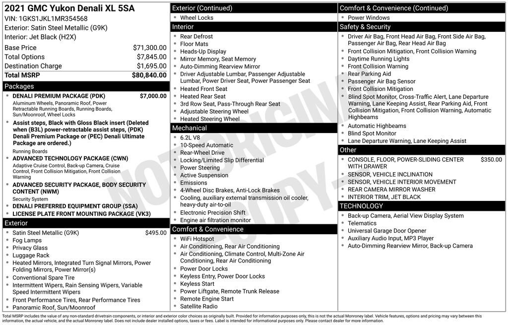 Priced below KBB Fair Purchase Price! 12-Way Power Seat Adjusters, 14 Speakers, 15 Diagonal Multi-Color Head-Up Display, 2 Presets For Outside Rearview Mirrors, 3.23 Rear Axle Ratio, 3rd Row 60/40 Power-Folding Split-Bench Seat, 3rd row seats: split-bench, 4-Wheel Disc Brakes, ABS brakes, Adaptive Cruise Control, Adaptive suspension, Advanced Security Package, Advanced Technology Package, Air Conditioning, Alloy wheels, AM/FM radio: SiriusXM with 360L, Apple CarPlay/Android Auto, Auto High-beam Headlights, Auto-dimming door mirrors, Auto-dimming Rear-View mirror, Auto-leveling suspension, Automatic Emergency Braking, Automatic temperature control, Bodyside moldings, Bose 14-Speaker Surround w/CenterPoint, Brake assist, Bright Front & Rear Door Sill Plates, Bumpers: body-color, Chrome Door Handles w/Body-Color Strip, Compass, Delay-off headlights, Denali Premium Package, Driver door bin, Driver vanity mirror, Dual Exhaust System, Dual front impact airbags, Dual front side impact airbags, Dual-Pane Panoramic Power Sunroof, Electronic Stability Control, Emergency communication system: OnStar and GMC connected services capable, Enhanced Automatic Emergency Braking, Floor Console, Following Distance Indicator, Forward Collision Alert, Four wheel independent suspension, Front & Rear Park Assist, Front anti-roll bar, Front Bucket Seats, Front Center Armrest, Front dual zone A/C, Front fog lights, Front Pedestrian Braking, Front reading lights, Fully automatic headlights, Galvano Bodyside Moldings, Garage door transmitter, Glass Breakage Sensor, Hands-Free Power Programmable Rear Liftgate, HD Radio, HD Surround Vision, Heads-Up Display, Heated & Ventilated Driver & Front Passenger Seats, Heated 2nd Row Outboard Position Seats, Heated Automatic Steering Wheel, Heated door mirrors, Heated Driver & Front Passenger Seats, Heated front seats, Heated rear seats, Heated steering wheel, Illuminated entry, Inside Rear-View Auto-Dimming Mirror, Inside Rearview Auto-Dimming Rear Camera Mirror, IntelliBeam Automatic High Beam On/Off, Jet Black Interior Trim, Lane Change Alert w/Side Blind Zone Alert, Lane Keep Assist w/Lane Departure Warning, Leather steering wheel, License Plate Front Mounting Package, Low tire pressure warning, Magnetic Ride Control Suspension, Memory seat, Navigation System, Occupant sensing airbag, Outside Heated Power-Adjustable Mirrors, Outside temperature display, Overhead airbag, Overhead console, Panic alarm, Passenger door bin, Passenger vanity mirror, Perforated Leather Seating Surfaces, Power door mirrors, Power driver seat, Power Liftgate, Power passenger seat, Power Release 2nd Row Bucket Seats, Power steering, Power Tilt & Telescopic Steering Column, Power windows, Power-Retractable Assist Steps, Preferred Equipment Group 5SA, Radio: AM/FM/SiriusXM w/Navigation, Rain sensing wipers, Rear air conditioning, Rear anti-roll bar, Rear Camera Mirror Washer, Rear Cross Traffic Alert, Rear Pedestrian Alert, Rear reading lights, Rear window defroster, Rear window wiper, Remote keyless entry, Roof rack: rails only, Safety Alert Seat, Security system, SiriusXM w/360L, Speed control, Speed-sensing steering, Split folding rear seat, Spoiler, Steering wheel memory, Steering wheel mounted audio controls, Tachometer, Telescoping steering wheel, Theft-Deterrent Alarm System, Tilt steering wheel, Traction control, Trip computer, Turn signal indicator mirrors, Universal Home Remote, Variably intermittent wipers, Vehicle Inclination Sensor, Vehicle Interior Movement Sensor, Ventilated front seats, Voltmeter, Wheel Locks, Wheels: 20 x 9 6-Spoke Polished Aluminum, Wheels: 22 x 9 Bright Machined Aluminum.