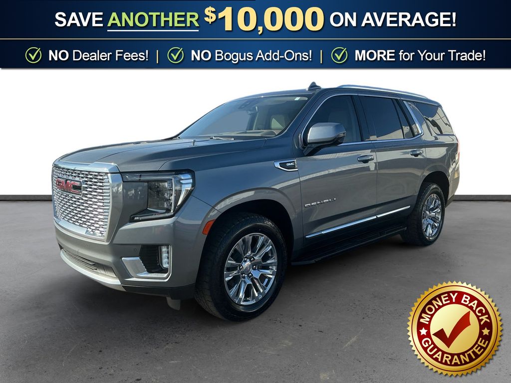 2021 GMC Yukon Denali Satin Steel Metallic Denali 4WD 10-Speed Automatic with Overdrive EcoTec3 6.2L V8 4WD, 12-Way Power Seat Adjusters, 14 Speakers, 15" Diagonal Multi-Color Head-Up Display, 2 Presets For Outside Rearview Mirrors, 3.23 Rear Axle Ratio, 3rd Row 60/40 Power-Folding Split-Bench Seat, 3rd row seats: split-bench, 4-Wheel Disc Brakes, ABS brakes, Adaptive suspension, Air Conditioning, Alloy wheels, AM/FM radio: SiriusXM with 360L, Apple CarPlay/Android Auto, Auto High-beam Headlights, Auto-dimming door mirrors, Auto-dimming Rear-View mirror, Auto-leveling suspension, Automatic Emergency Braking, Automatic temperature control, Bodyside moldings, Bose 14-Speaker Surround w/CenterPoint, Brake assist, Bright Front & Rear Door Sill Plates, Bumpers: body-color, Chrome Door Handles w/Body-Color Strip, Compass, Delay-off headlights, Driver door bin, Driver vanity mirror, Dual Exhaust System, Dual front impact airbags, Dual front side impact airbags, Electronic Stability Control, Emergency communication system: OnStar and GMC connected services capable, Following Distance Indicator, Forward Collision Alert, Four wheel independent suspension, Front & Rear Park Assist, Front anti-roll bar, Front Bucket Seats, Front Center Armrest, Front dual zone A/C, Front fog lights, Front Pedestrian Braking, Front reading lights, Fully automatic headlights, Galvano Bodyside Moldings, Garage door transmitter, Hands-Free Power Programmable Rear Liftgate, HD Radio, HD Surround Vision, Heads-Up Display, Heated & Ventilated Driver & Front Passenger Seats, Heated 2nd Row Outboard Position Seats, Heated Automatic Steering Wheel, Heated door mirrors, Heated Driver & Front Passenger Seats, Heated front seats, Heated rear seats, Heated steering wheel, Hill Descent Control, Illuminated entry, Inside Rear-View Auto-Dimming Mirror, IntelliBeam Automatic High Beam On/Off, Lane Change Alert w/Side Blind Zone Alert, Lane Keep Assist w/Lane Departure Warning, Leather steering wheel, Low tire pressure warning, Magnetic Ride Control Suspension, Memory seat, Navigation System, Occupant sensing airbag, Outside Heated Power-Adjustable Mirrors, Outside temperature display, Overhead airbag, Overhead console, Panic alarm, Passenger door bin, Passenger vanity mirror, Perforated Leather Seating Surfaces, Power door mirrors, Power driver seat, Power Liftgate, Power passenger seat, Power Release 2nd Row Bucket Seats, Power steering, Power Tilt & Telescopic Steering Column, Power windows, Preferred Equipment Group 5SA, Radio: AM/FM/SiriusXM w/Navigation, Rain sensing wipers, Rear air conditioning, Rear anti-roll bar, Rear Cross Traffic Alert, Rear Pedestrian Alert, Rear reading lights, Rear window defroster, Rear window wiper, Remote keyless entry, Roof rack: rails only, Safety Alert Seat, Security system, SiriusXM w/360L, Speed control, Speed-sensing steering, Split folding rear seat, Spoiler, Steering wheel memory, Steering wheel mounted audio controls, Tachometer, Telescoping steering wheel, Tilt steering wheel, Traction control, Trip computer, Turn signal indicator mirrors, Universal Home Remote, Variably intermittent wipers, Ventilated front seats, Voltmeter, Wheels: 20" x 9" 6-Spoke Polished Aluminum, 4WD.
