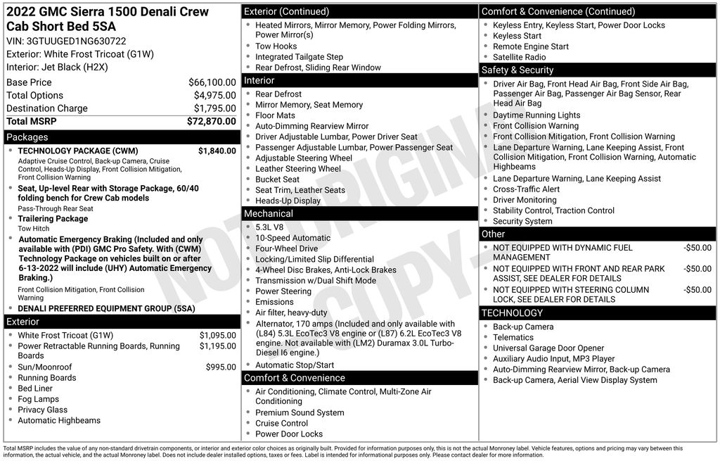 2022 GMC Sierra 1500 Denali White Frost Tricoat Denali 4WD 10-Speed Automatic EcoTec3 5.3L V8 10-Speed Automatic, 4WD, Jet Black Leather, 10-Way Power Driver Seat Adjuster w/Lumbar, 10-Way Power Passenger Seat Adjuster w/Lumbar, 120-Volt Bed Mounted Power Outlet, 120-Volt Instrument Panel Power Outlet, 170 Amp Alternator, 2 Charge/Data USB Ports Inside Center Console, 2 Type-C Charge-Only Rear USB Ports, 2 USB Ports, 3.23 Rear Axle Ratio, 4-Wheel Disc Brakes, 7 Speakers, ABS brakes, Adaptive Cruise Control, Adaptive suspension, Air Conditioning, Alloy wheels, AM/FM radio: SiriusXM with 360L, Apple CarPlay/Android Auto, Auto High-beam Headlights, Auto-dimming door mirrors, Auto-dimming Rear-View mirror, Auto-Locking Rear Differential, Automatic Emergency Braking, Automatic temperature control, Auxiliary External Transmission Oil Cooler, Bed View Camera, Brake assist, Buckle to Drive, Bumpers: body-color, Chrome Header w/Signature Denali Chrome Grille, Chrome Recovery Hooks, Chrome Wheel To Wheel Assist Steps, Color-Keyed Carpeting Floor Covering, Compass, Deep-Tinted Glass, Delay-off headlights, Denali Premium Suspension w/Adaptive Ride Control, Driver door bin, Driver Memory, Driver vanity mirror, Dual front impact airbags, Dual front side impact airbags, Electric Rear-Window Defogger, Electrical Steering Column Lock, Electronic Stability Control, Emergency communication system: OnStar and GMC Connected Services capable, Floor-Mounted Center Console, Following Distance Indicator, Forge Perforated Leather Seat Trim, Forward Collision Alert, Front anti-roll bar, Front Bucket Seats, Front Center Armrest, Front dual zone A/C, Front fog lights, Front Pedestrian Braking, Front Rainsensing Wipers, Front reading lights, Front wheel independent suspension, Fully automatic headlights, Garage door transmitter, Genuine wood console insert, Genuine wood dashboard insert, Genuine wood door panel insert, GMC Connected Access Capable, GMC MultiPro Power Steps, HD Surround Vision, Heated 2nd Row Outboard Seats, Heated door mirrors, Heated Driver & Front Outboard Passenger Seating, Heated front seats, Heated rear seats, Heated Steering Wheel, Heated steering wheel, Heavy-Duty Air Filter, Hill Descent Control, Hitch Guidance, Hitch Guidance w/Hitch View, Illuminated entry, In-Vehicle Trailering App, Integrated Trailer Brake Controller, IntelliBeam Automatic High Beam On/Off, Keyless Open & Start, Lane Keep Assist w/Lane Departure Warning, LED Cargo Area Lighting, Low tire pressure warning, Memory seat, Multicolor 15" Diagonal Head-Up Display, Navigation System, Not Equipped w/Dynamic Fuel Management, Not Equipped w/Front & Rear Park Assist, Not Equipped w/Steering Column Lock, Occupant sensing airbag, OnStar & GMC Connected Services Capable, Outside temperature display, Overhead airbag, Overhead console, Panic alarm, Passenger door bin, Passenger vanity mirror, Perimeter Lighting, Power Door Locks, Power door mirrors, Power driver seat, Power Front Passenger Windows w/Express Up/Down, Power Front Windows w/Driver Express Up/Down, Power passenger seat, Power Rake & Telescoping Steering Column, Power Rear Windows w/Express Down, Power Sliding Rear Window w/Rear Defogger, Power steering, Power Sunroof, Power windows, Preferred Equipment Group 5SA, Premium audio system: GMC Infotainment System, Premium Bose 7-Speaker Sound System, Push Button Start, Radio data system, Radio: Premium GMC Infotainment Audio System, Rain sensing wipers, Rear Camera Mirror, Rear Cross Traffic Braking, Rear Pedestrian Detection, Rear reading lights, Rear seat center armrest, Rear step bumper, Rear Wheelhouse Liners, Rear window defroster, Remote keyless entry, Remote Vehicle Starter System, Safety Alert Seat, Security system, SiriusXM w/360L, Speed control, Speed-sensing steering, Split folding rear seat, Spray-On Pickup Bed Liner w/Denali Logo, Steering Wheel Audio Controls, Steering wheel mounted audio controls, Tachometer, Technology Package, Telescoping steering whee