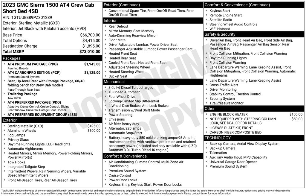 2023 GMC Sierra 1500 AT4 **Here at Long-Lewis we believe in being transparent. We have no Doc fees, or any other hidden fees. We are a one price store and give our best price up front and they are clearly marked on all our inventory.** Sterling Metallic 4WD 10-Speed Automatic 3.0L I6 10-Speed Automatic, 4WD, Jet Black With Kalahari Accents Leather.