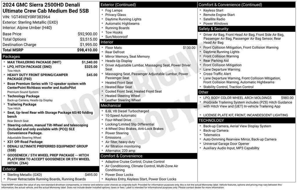 Recent Arrival! 10-Speed Automatic, 4WD, Alpine Umber Leather, 12 Speakers, 120-Volt Bed Mounted Power Outlet, 120-Volt Instrument Panel Power Outlet, 16-Way Power Driver Seat Adjuster w/Lumbar, 16-Way Power Passenger Seat Adjuster w/Lumbar, 2 Charge-Only Rear USB Ports, 2 Charge/Data USB Ports Inside Center Console, 2 USB Ports, 2-Speed Active Transfer Case, 220-Amp Alternator, 3.42 Axle Ratio, 4-Wheel Disc Brakes, ABS brakes, Air Conditioning, Alloy wheels, AM/FM radio: SiriusXM with 360L, Apple CarPlay/Android Auto, Auto High-beam Headlights, Auto-dimming door mirrors, Auto-dimming Rear-View mirror, Automatic Emergency Braking, Automatic temperature control, Bed View Camera w/2 Trailer Camera Provisions, Block heater, Body Color Wheel Arch Moldings (LPO), Bose Premium Series 12-Speaker System, Brake assist, Buckle to Drive, Bumpers: body-color, Compass, Deep-Tinted Glass, Delay-off headlights, Driver door bin, Driver Memory, Driver vanity mirror, Dual front impact airbags, Dual front side impact airbags, Dual Heavy-Duty 70 Amp Battery, Electric Rear-Window Defogger, Electronic Stability Control, Emergency communication system: OnStar and GMC connected services capable, Floor-Mounted Center Console, Following Distance Indicator, Forward Collision Alert, Front anti-roll bar, Front Bucket Seats, Front Center Armrest, Front dual zone A/C, Front fog lights, Front License Plate Kit, Front Pedestrian Braking, Front Prem Floor Liners w/Removable Carpet Insert, Front Rain-Sensing Wipers, Front reading lights, Front wheel independent suspension, Full Grain Leather Seat Trim, Fully automatic headlights, Garage door transmitter, Genuine wood dashboard insert, Genuine wood door panel insert, GMC Connected Access Capable, Gooseneck/5th Wheel Prep Package, HD Surround Vision, Heads-Up Display, Heated 2nd Row Outboard Seats, Heated door mirrors, Heated Driver & Front Outboard Passenger Seats, Heated front seats, Heated rear seats, Heated steering wheel, Heavy Duty Front Spring/Camper Package, Hill Descent Control, Hitch Guidance w/Hitch View, Hitch Package (LPO), Illuminated entry, In-Vehicle Trailering System App, Inside Rearview Auto-Dimming Rear Camera Mirror, Integrated Trailer Brake Controller, IntelliBeam Automatic High Beam On/Off, Keyless Open & Start, Lane Departure Warning System, Leather steering wheel, LED Cargo Area Lighting, LED Smoked Amber Roof Marker Lamps, Low tire pressure warning, Manual Tilt-Wheel/Telescoping Steering Column, Max Trailering Package, Memory seat, Multicolor 15" Diagonal Head-Up Display, Occupant sensing airbag, Off-Road Suspension, OnStar & GMC Connected Services Capable, Outside temperature display, Overhead airbag, Overhead console, Panic alarm, Passenger door bin, Passenger vanity mirror, Pickup Box, Power door mirrors, Power driver seat, Power Front Passenger Windows w/Express Up/Down, Power moonroof, Power passenger seat, Power Sliding Rear Window w/Defogger, Power steering, Power Sunroof, Power windows, Preferred Equipment Group 5SB, Premium audio system: Premium GMC Infotainment System, Push Button Start, Radio: AM/FM w/Premium GMC Infotainment System, Rain sensing wipers, Rear Cross Traffic Alert, Rear Prem Floor Liners w/Removable Carpet Insert, Rear reading lights, Rear seat center armrest, Rear step bumper, Rear Wheelhouse Liners, Rear window defroster, Remote keyless entry, Remote Vehicle Starter System, Safety Alert Seat, Security system, Signature Denali Grille in Vadar Chrome, SiriusXM w/360L, Speed control, Speed-sensing steering, Split folding rear seat, Spray-On Bedliner w/Denali Logo, Steering Wheel Audio Controls, Steering wheel mounted audio controls, Tachometer, Technology Package, Telescoping steering wheel, Tilt steering wheel, Traction control, Trailer Cam Provisions & Trailer Viewing Software, Trailer Side Blind Zone Alert, Trailer Tire Pressure Monitor Sensors, Trip computer, Turn signal indicator mirrors, Ultrasonic Front & Rear Park Assist, Unauthorized Entry Theft-Deterrent