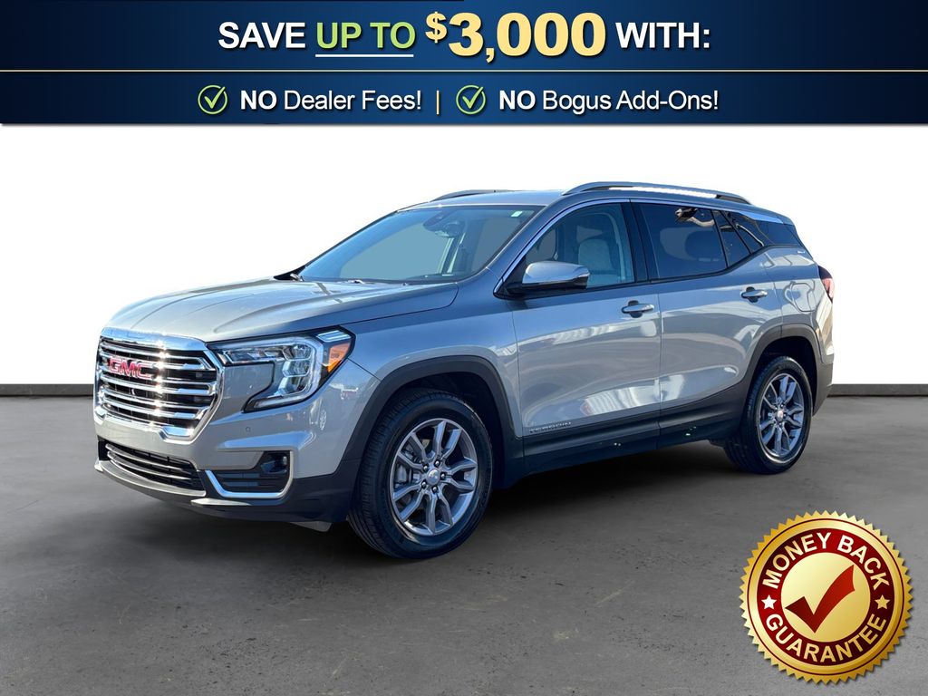 2024 GMC Terrain SLT Sterling Metallic SLT AWD 9-Speed Automatic 1.5L DOHC AWD, 2 USB Data Ports, 2 USB Data Ports w/SD Card Reader, 3.47 Final Drive Axle Ratio, 4-Wheel Disc Brakes, 6 Speakers, 6-Speaker Audio System Feature, 6-Way Power Front Passenger Seat, 8-Way Power Driver Seat Adjuster, ABS brakes, Adaptive Cruise Control, Air Conditioning, Alloy wheels, AM/FM radio: SiriusXM, Auto High-beam Headlights, Auto-dimming Rear-View mirror, Automatic temperature control, Bluetooth® For Phone, Brake assist, Bumpers: body-color, Compass, Delay-off headlights, Driver & Front Passenger Heated Seats, Driver door bin, Driver vanity mirror, Dual front impact airbags, Dual front side impact airbags, Electronic Stability Control, Emergency communication system: OnStar and GMC connected services capable, Four wheel independent suspension, Front & Rear Park Assist, Front anti-roll bar, Front Bucket Seats, Front Center Armrest, Front dual zone A/C, Front fog lights, Front Passenger 2-Way Power Lumbar, Front reading lights, Fully automatic headlights, Garage door transmitter, GMC Pro Safety Plus, HD Surround Vision, Head-Up Display, Heated door mirrors, Heated front seats, Heated steering wheel, Illuminated entry, Lane Change Alert w/Side Blind Zone Alert, Low tire pressure warning, Memory seat, Occupant sensing airbag, Outside temperature display, Overhead airbag, Overhead console, Panic alarm, Passenger door bin, Passenger vanity mirror, Perforated Leather-Appointed Seat Trim, Power door mirrors, Power Driver Lumbar Control, Power driver seat, Power Liftgate, Power passenger seat, Power steering, Power windows, Preferred Equipment Group 4SA, Radio data system, Radio: GMC Infotainment Audio System w/8" Display, Rear anti-roll bar, Rear Cross-Traffic Alert, Rear Park Assist, Rear seat center armrest, Rear window defroster, Rear window wiper, Remote keyless entry, Roof rack: rails only, Safety Alert Seat, Security system, SiriusXM, Speed control, Speed-sensing steering, Split folding rear seat, Spoiler, Steering wheel mounted audio controls, Tachometer, Tech Package, Telescoping steering wheel, Tilt steering wheel, Traction control, Trip computer, Turn signal indicator mirrors, Variably intermittent wipers, Wheels: 18" x 7" Silver Painted Aluminum, Wireless Apple CarPlay/Wireless Android Auto, AWD.
