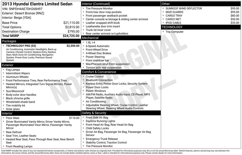 2013 Hyundai Elantra Limited Desert Bronze Limited FWD 6-Speed Automatic with Overdrive 1.8L 4-Cylinder DOHC 16V Dual CVVT 17" x 7.0" J Alloy Wheels, 4-Wheel Disc Brakes, 6 Speakers, 60/40 Split Fold-Down Rear Seatback, ABS brakes, ABS w/Electronic Brake Force Distribution (EBD), Adjustable Head Restraints, Advanced Dual Front Airbags, Air Conditioning, Alloy wheels, AM/FM radio: XM, Automatic Headlamps, Black Chrome Grille, Bluetooth® Hands-Free Phone System, Bodycolor Door Handles & Mirrors, Brake assist, Bumpers: body-color, Cargo Net, Cargo Tray, Carpeted Floor Mats, CD player, Center Console w/Storage Compartment & Armrest, Daytime Running Lights, Delay-off headlights, Driver door bin, Driver vanity mirror, Dual Automatic Temperature Control, Dual front impact airbags, Dual front side impact airbags, Dual Heated Power Outside Mirrors, Electronic Stability Control, Front & Rear Door Map Pockets, Front 2-Speed Intermittent Wipers, Front anti-roll bar, Front Bucket Seats, Front Center Armrest, Front Fog Lights, Front fog lights, Front reading lights, Front wheel independent suspension, Heated door mirrors, Heated Front Bucket Seats, Heated front seats, Heated Rear Seats, Heated rear seats, Illuminated entry, Illuminated Ignition Key Cylinder Surround, Illuminated Vanity Mirrors w/Extensions, Immobilizer, iPod Cable, Leather Seating Surfaces, Leather Wrapped Steering Wheel & Shift Knob, Leatherette Door Trim Inserts, Limited Badge, Limited Technology Package, Low tire pressure warning, Lower Multi-Box w/Cover, Manual Air Conditioning, Map & Cargo Area Lights, Motor Driven Power Steering (MDPS), Mud Guards, Navigation System, Occupant sensing airbag, One Touch Up Drivers Window, Option Group 03, Outside temperature display, Overhead airbag, Overhead console, Panic alarm, Passenger door bin, Passenger vanity mirror, Power Door Locks, Power door mirrors, Power driver seat, Power Glass Tilt & Slide Sunroof, Power moonroof, Power steering, Power windows, Power Windows w/Driver's Auto-Down, Proximity Key Entry w/Electronic Push Button Start, Radio: AM/FM/XM/CD/MP3, Radio: Autonet AM/FM/CD/MP3 w/SiriusXM Satellite, Rear Defroster, Rear seat center armrest, Rear window defroster, Rear-View Camera, Remote keyless entry, Remote Keyless Entry System w/Alarm, Security system, Side Mirrors w/Integrated Turn Signals, Sliding Center Armrest, Solar Glass, Speed control, Speed-sensing steering, Split folding rear seat, Steering Wheel Audio Controls, Steering wheel mounted audio controls, Steering Wheel Mounted Cruise Control, Sunroof Wind Deflector, Tachometer, Telescopic Steering Wheel, Telescoping steering wheel, Tilt Steering Wheel, Tilt steering wheel, Tire Pressure Monitoring System, Traction control, Traction Control System, Trip Computer, Trip computer, Trunk Lid Inner Cover, Turn signal indicator mirrors, Variably intermittent wipers, Vehicle Stability Management, Windshield Shade Band.