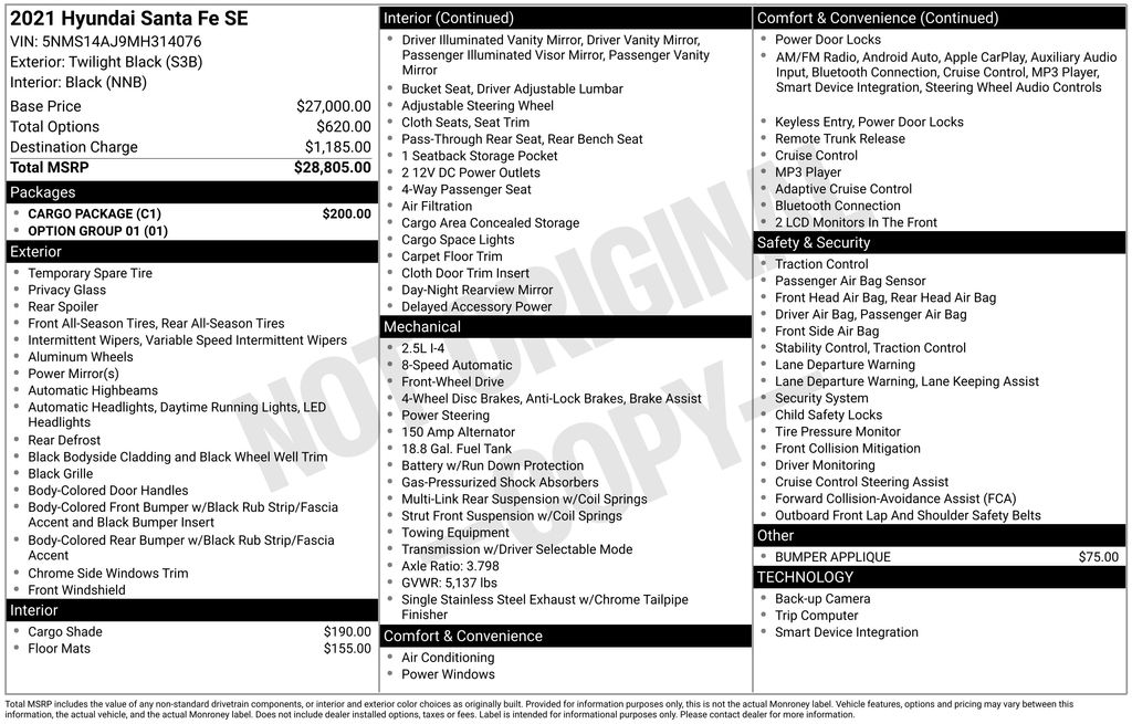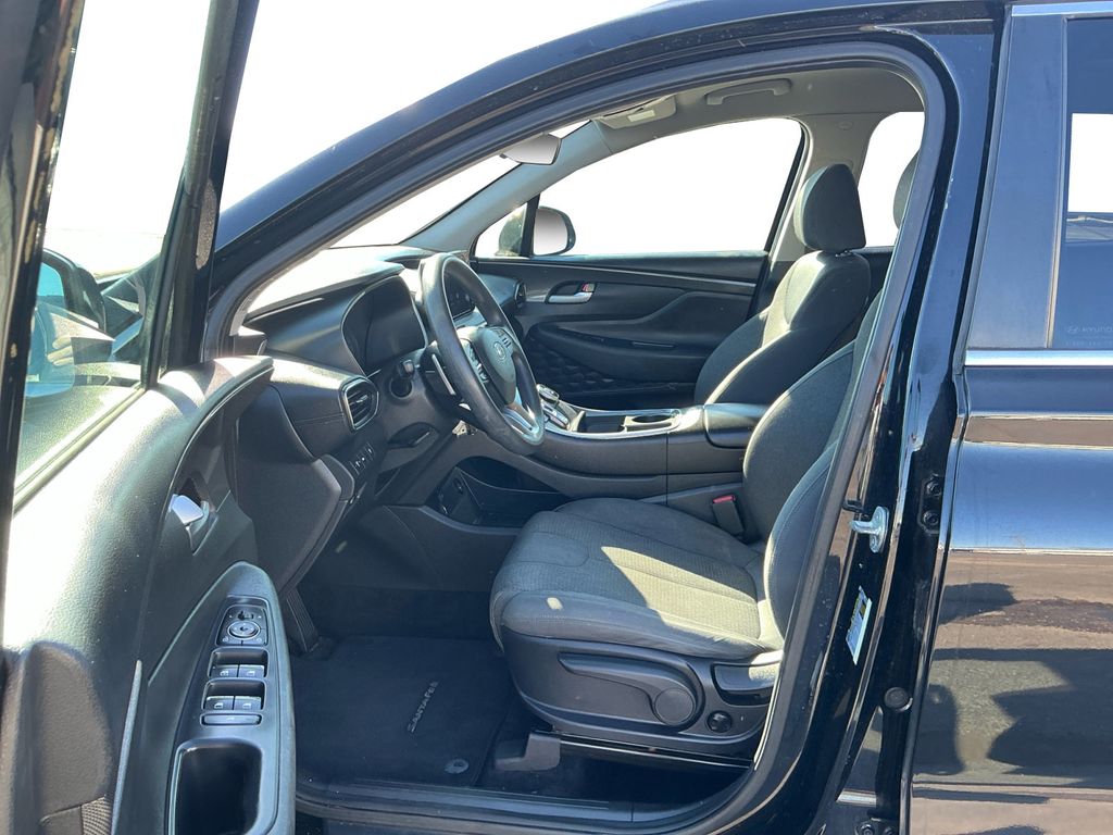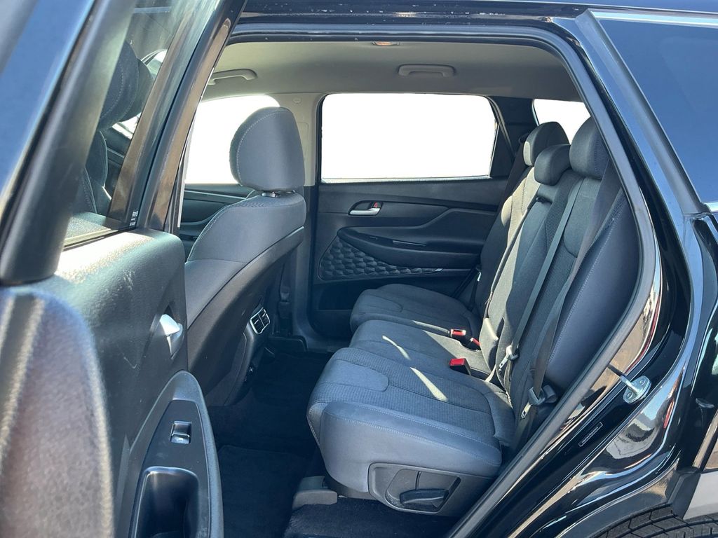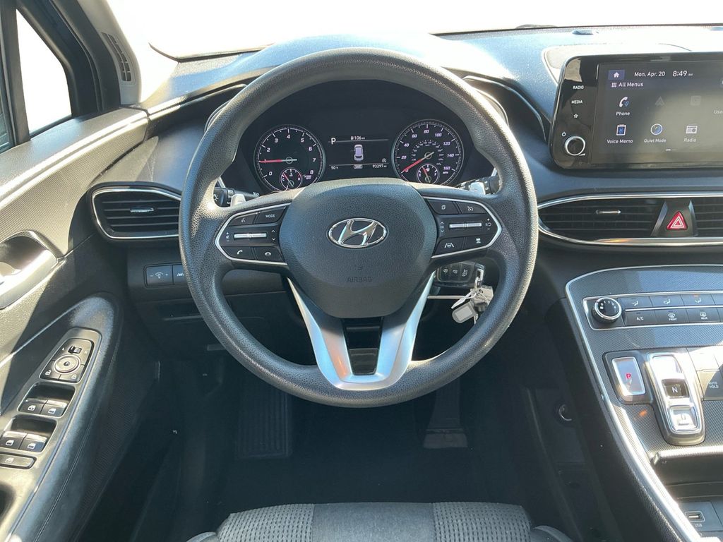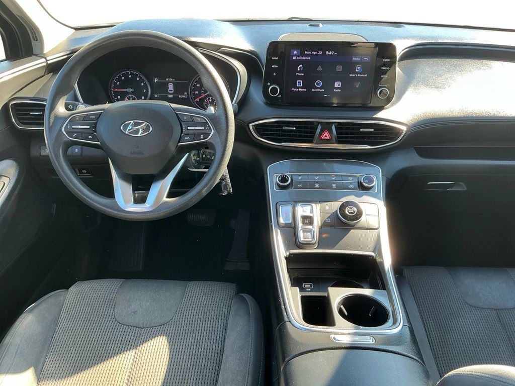 2021 Hyundai Santa Fe SE Twilight Black SE FWD 8-Speed Automatic with SHIFTRONIC 2.5L I4 Black Cloth, 18" x 7.5J Alloy Wheels, 4-Wheel Disc Brakes, 6 Speakers, ABS brakes, Air Conditioning, Alloy wheels, AM/FM radio, Apple CarPlay & Android Auto, Auto High-beam Headlights, Axle Ratio: 3.798, Brake assist, Bumper Applique, Bumpers: body-color, Cargo Cover/Screen, Cargo Net, Cargo Package, Cargo Tray, Carpeted Floor Mats, Delay-off headlights, Driver door bin, Driver vanity mirror, Dual front impact airbags, Dual front side impact airbags, Electronic Stability Control, Exterior Parking Camera Rear, First Aid Kit, Four wheel independent suspension, Front anti-roll bar, Front Bucket Seats, Front Center Armrest, Front reading lights, Fully automatic headlights, Illuminated entry, Low tire pressure warning, Occupant sensing airbag, Option Group 01, Outside temperature display, Overhead airbag, Overhead console, Panic alarm, Passenger door bin, Passenger vanity mirror, Power door mirrors, Power steering, Power windows, Radio: AM/FM/MP3 Display Audio, Rear anti-roll bar, Rear seat center armrest, Rear window defroster, Rear window wiper, Remote keyless entry, Security system, Speed control, Speed-sensing steering, Split folding rear seat, Spoiler, Steering wheel mounted audio controls, Tachometer, Telescoping steering wheel, Tilt steering wheel, Traction control, Trip computer, Variably intermittent wipers, YES Essentials Stain-Resistant Cloth Seat Trim, Black Cloth.