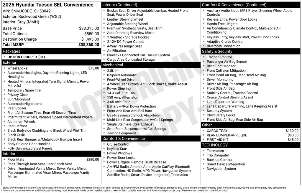 2025 Hyundai Tucson SEL Convenience Rockwood Green SEL Convenience FWD 8-Speed Automatic with SHIFTRONIC 2.5L I4 DGI DOHC 16V LEV3-SULEV30 187hp 18" Alloy Wheels, 4-Wheel Disc Brakes, 6 Speakers, ABS brakes, Air Conditioning, All Season Fitted Liners, Alloy wheels, AM/FM radio: SiriusXM, Apple CarPlay & Android Auto, Auto High-beam Headlights, Auto-dimming Rear-View mirror, Automatic temperature control, Brake assist, Bumpers: body-color, Cargo Tray, Carpeted Floor Mats, Delay-off headlights, Driver door bin, Driver vanity mirror, Dual front impact airbags, Dual front side impact airbags, Electronic Stability Control, Emergency communication system: Bluelink+, First Aid Kit, Four wheel independent suspension, Front anti-roll bar, Front Bucket Seats, Front Center Armrest, Front dual zone A/C, Front reading lights, Fully automatic headlights, H-Tex Seat Trim, Heated door mirrors, Heated Front Bucket Seats, Heated front seats, Illuminated entry, Leather steering wheel, Low tire pressure warning, Navigation System, Occupant sensing airbag, Option Group 01, Outside temperature display, Overhead airbag, Overhead console, Panic alarm, Passenger door bin, Passenger vanity mirror, Power door mirrors, Power driver seat, Power Liftgate, Power moonroof, Power steering, Power windows, Radio data system, Radio: AM/FM/HD Audio System, Rear anti-roll bar, Rear Bumper Applique, Rear reading lights, Rear seat center armrest, Rear side impact airbag, Rear window defroster, Rear window wiper, Remote keyless entry, Security system, Speed control, Split folding rear seat, Spoiler, Steering wheel mounted audio controls, Tachometer, Telescoping steering wheel, Tilt steering wheel, Traction control, Trip computer, Turn signal indicator mirrors, Variably intermittent wipers, Wheel Locks.