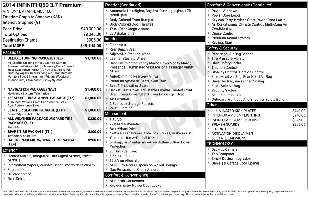 2014 INFINITI Q50 Premium Graphite Shadow Premium RWD 7-Speed Automatic with Manual Shift 3.7L V6 DOHC 24V 14 Speakers, 17" Aluminum Alloy Wheels, 19" Aluminum-Alloy Wheels, 19" Sport Tire & Wheel Package, 4-Wheel Disc Brakes, 60/40 Split-Folding Rear Seats, ABS brakes, Activation Disclaimer, Air Conditioning, All Weather Package w/Spare Tire Package, All-Season Mats, Alloy wheels, AM/FM radio: SiriusXM, Anti-whiplash front head restraints, Around View Monitor w/Moving Object Detection, Auto-Dimming Outside Mirrors w/Reverse Tilt-Down, Auto-dimming Rear-View mirror, Automatic temperature control, BOSE Centerpoint Simulated Surround, Brake assist, Bumpers: body-color, Cargo Net, Cargo Package w/Spare Tire Package, CD player, Compass, Delay-off headlights, Deluxe Touring Package, Direct Adaptive Steering, Driver door bin, Driver Seat 2-Way Power Lumbar, Driver vanity mirror, Dual front impact airbags, Dual front side impact airbags, Dual Occupant Memory System For Driver's Seat, Electronic Stability Control, First Aid Kit, Floor Mats, Four wheel independent suspension, Front anti-roll bar, Front Bucket Seats, Front Center Armrest, Front dual zone A/C, Front fog lights, Front reading lights, Fully automatic headlights, Garage door transmitter: HomeLink, Heated door mirrors, Heated Front Seats, Heated front seats, Illuminated entry, Illuminated Kick Plates, INFINITI InTouch Navigation System, INFINITI Studio on Wheels by Bose, INFINITI Welcome Lighting, Interior Ambient Lighting, Jack Kit, Leather Seating Package, Leather Shift Knob, Leather steering wheel, Leather-Appointed Seats, Literature Kit, Low tire pressure warning, Maple Wood Trim, Navigation Package, Occupant sensing airbag, Outside temperature display, Overhead airbag, Overhead console, Panic alarm, Passenger door bin, Passenger vanity mirror, Power door mirrors, Power driver seat, Power moonroof, Power passenger seat, Power steering, Power Tilt & Telescopic Steering Column, Power windows, Premium Leatherette Seating Surfaces, Radio data system, Radio: AM/FM/CD w/MP3 Playback Capability, Rain-Sensing Front Windshield Wipers, Rear anti-roll bar, Rear reading lights, Rear seat center armrest, Rear window defroster, Remote keyless entry, Security system, Spare Tire Package, Speed control, Speed-sensing steering, Speed-Sensitive Wipers, Splash Guards, Steering wheel mounted audio controls, Tachometer, Telescoping steering wheel, Tilt steering wheel, Traction control, Trip computer, Trunk Mat, Trunk Protector, Turn signal indicator mirrors, Variably intermittent wipers.