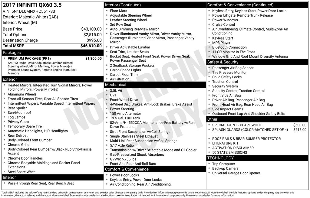 2017 INFINITI QX60 Base Majestic White FWD Sport-Tuned CVT 3.5L V6 2-Way Driver's Seat Power Lumbar Support, 3rd row seats: bench, 4-Wheel Disc Brakes, 5.17 Axle Ratio, 6 Speakers, ABS brakes, Air Conditioning, Alloy wheels, AM/FM radio: SiriusXM, AM/FM/CD/MP3 Audio System, Auto-dimming Rear-View mirror, Automatic temperature control, Bodyside moldings, Brake assist, Bumpers: body-color, CD player, Delay-off headlights, Driver door bin, Driver vanity mirror, Dual front impact airbags, Dual front side impact airbags, Dual Occupant Memory System, Electronic Stability Control, Enhanced Intelligent Key Memory, Entry & Exit Assist, Four wheel independent suspension, Front anti-roll bar, Front Bucket Seats, Front Center Armrest w/Storage, Front dual zone A/C, Front fog lights, Front reading lights, Fully automatic headlights, Garage door transmitter, Heated door mirrors, Heated Front Seats, Heated front seats, Heated Steering Wheel, High intensity discharge headlights: Bi-Xenon, Illuminated entry, Leather Shift Knob, Leather steering wheel, Leather-Appointed Seats, Low tire pressure warning, Occupant sensing airbag, Outside Mirrors w/Reverse Tilt-Down Feature, Outside temperature display, Overhead airbag, Overhead console, Panic alarm, Passenger door bin, Passenger vanity mirror, Power door mirrors, Power driver seat, Power Liftgate, Power moonroof, Power passenger seat, Power steering, Power windows, Premium Package, Radio data system, Radio: AM/FM/CD/DVD w/MP3 Playback Capability, Rear air conditioning, Rear anti-roll bar, Rear reading lights, Rear seat center armrest, Rear window defroster, Rear window wiper, Reclining 3rd row seat, Remote Engine Start, Remote keyless entry, Security system, Speed control, Speed-sensing steering, Speed-Sensitive Wipers, Splash Guards (Color-Matched Set of 4), Split folding rear seat, Spoiler, Steering wheel mounted audio controls, Tachometer, Telescoping steering wheel, Tilt steering wheel, Traction control, Trip computer, Turn signal indicator mirrors, Variably intermittent wipers, Wheels: 18" Triple 5-Spoke Aluminum-Alloy.