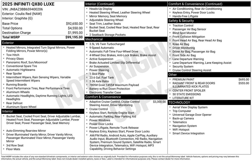 2025 INFINITI QX80 LUXE **Here at Long-Lewis we believe in being transparent. We have no Doc fees, or any other hidden fees. We are a one price store and give our best price up front and they are clearly marked on all our inventory.** Coulis Red 4WD 9-Speed Automatic 3.5L V6 DOHC 24V