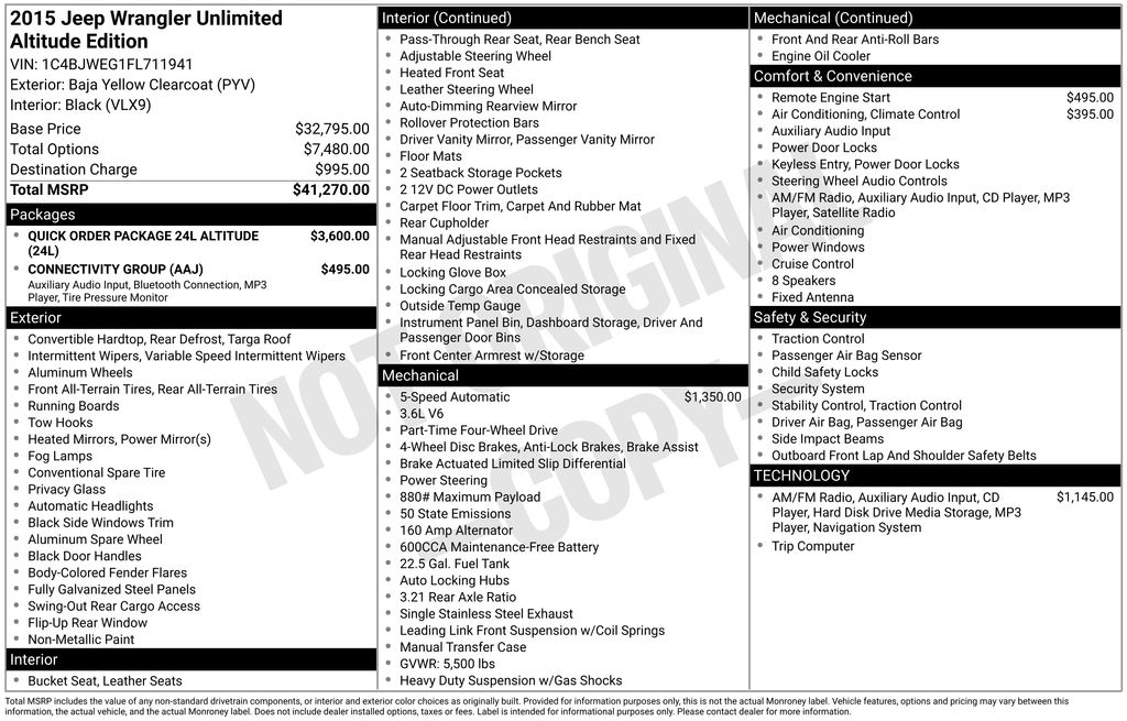 2015 Jeep Wrangler Baja Yellow Clearcoat 4WD 5-Speed Automatic 3.6L V6 24V VVT 18" x 7.5" Polished Satin Carbon Wheels, 3.21 Rear Axle Ratio, 4-Wheel Disc Brakes, 40GB Hard Drive w/28GB Available, 5-Year SIRIUSXM Travel Link Service, 6.5" Touch Screen Display, 8 Speakers, ABS brakes, Air Conditioning, Air Conditioning w/Auto Temperature Control, Air Filtering, Alloy wheels, Altitude Grille, AM/FM radio, Audio Jack Input for Mobile Devices, Auto-dimming Rear-View mirror, Black Accent Stitching, Black Front Bumper, Black High Gloss Exterior Mirror Cap, Black Jeep Grille Badge, Black Leather Seats w/Accent Stitch, Black Rear Bumper, Black/Chrome Screws Fuel Filler Door, Brake assist, CD player, Chrome/Leather Wrapped Shift Knob, Cloth Bucket Seats, Compass, Connectivity Group, Driver door bin, Driver vanity mirror, Dual front impact airbags, Electronic Stability Control, Front anti-roll bar, Front Bucket Seats, Front Center Armrest w/Storage, Front fog lights, Front reading lights, Fully automatic headlights, Gloss Black Fascia Applique, GPS Navigation, Heated door mirrors, Heated Front Seats, Heavy Duty Suspension w/Gas Shocks, High Gloss Black Center Wheel Caps, Humidity Sensor, Illuminated entry, Integrated roll-over protection, Jeep Wrangler Altitude Edition, Leather steering wheel, Leather Wrapped Steering Wheel, Low Gloss Black Wrangler Decal, Low tire pressure warning, MOPAR Black Tail Lamp Guards, Occupant sensing airbag, Outside temperature display, Panic alarm, Passenger door bin, Passenger vanity mirror, Piano Black Interior Accents, Power Bulge Hood, Power door mirrors, Power steering, Power windows, Quick Order Package 24L Altitude, Radio data system, Radio: Uconnect 130 AM/FM/CD/MP3, Radio: Uconnect 430N CD/DVD/MP3/HDD/NAV, Rear anti-roll bar, Remote keyless entry, Remote Start System, Remote USB Port, Security system, SIRIUSXM Travel Link, Speed control, Split folding rear seat, Steering wheel mounted audio controls, Tachometer, Tilt steering wheel, Tire Pressure Monitoring Display, Traction control, Trip computer, Variably intermittent wipers, Vehicle Information Center, Wheels: 18" x 7.5" 5-Spoke Gloss Black Aluminum.